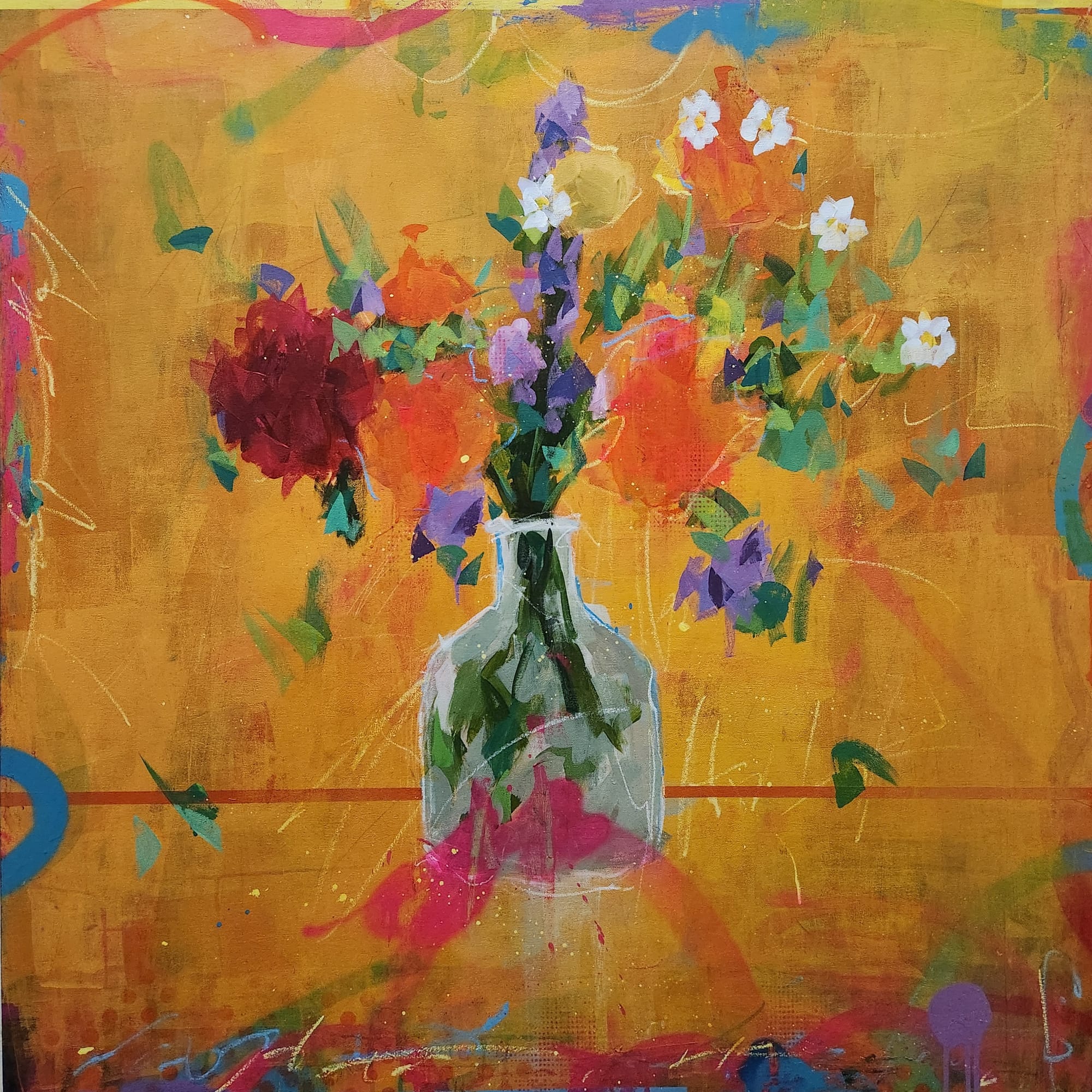 Javiel’s eye-popping burst of palette knife-painted florals came next, the yellow ochre background filled with layer upon layer of textural tidbits, the artist’s interest in patina and surface wear, the decay, in the world around us. Stenciled dots in hot pinks and oranges mingle with floral schmears in lilacs and periwinkles, eggplants and indigos. Electric oranges and wine reds, tempered by turquoise, and tiny blossoms of white, spotted centers sunflower yellow, barely contained in a clear glass vase, what might be a hibiscus bloom splayed at the base. Javiel also channels his lively strokes into “contemporary pet portraits,” an excellent gift for a fur-loving friend (or, you know, yourself).