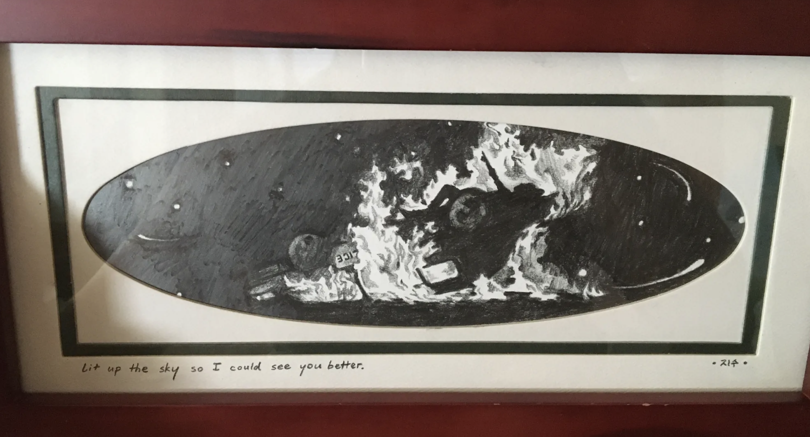 I reworked the concept I made last July, replacing a police car from my original drawing with an unmarked car to represent ICE. I was sacrificing legibility, but I figured it was at least a piece that helped me process and that someone might buy for $20 or so. When I brought my painting to the fundraiser, I saw it was in good company.