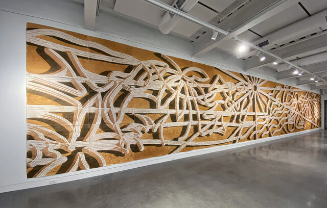 One more corner spills from Intersected Horizons into Paola Vega’s gallery. Deconstructing splotches that spread from massive canvases onto the actual walls, Vega’s five paintings are aggressively pleasant. Most are titled after their prominent colors, like the steamy, liquid-evening mood of Blue (2019). On the epicentral bench, viewers are dwarfed by the epic 334-inch-long panel of Yellow and Violet’s (2018) springtime rumpus. Color fields remind me of Rothko or Jeremy Blake’s ethereal transitions in Punch-Drunk Love, but there’s a different love emanating from Vega’s paint: the kind that engulfs you, womb-like, if that womb forgoes blood and amniotic goo to bathe you in a rippling Easter-morning hayfield between blurry creeks.