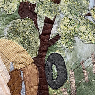 On the other hand, her piece Sunday Paper uses quilting as the actual medium to depict a portrait of a grandfather and grandchild in the ritual of reading the Sunday paper together. Its clever uses of mixed materials and stitching variation to create texture and character is a hallmark of pieces throughout the gallery.