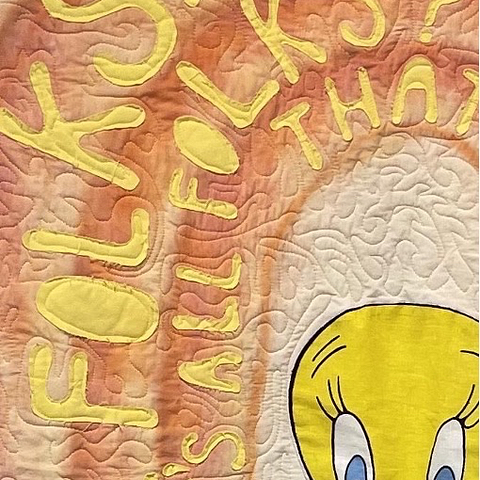 Just a few of many examples of this are Coorain Devin’s Kraft Singles American Cheese Slices, shrouded in the thin plastic wrapping native to a Kraft single; Callan Downing’s In His Image, whose rambling and playful stitching added to the cartoon quality of the quilt; and both of Chris Edwards’ works that communicated a feeling of three-dimensionality through the use of zippy fabrics. Then, of course, there were the works that didn’t use traditional fabrics at all, opting instead for quilted beer koozies or plastic wrappers.