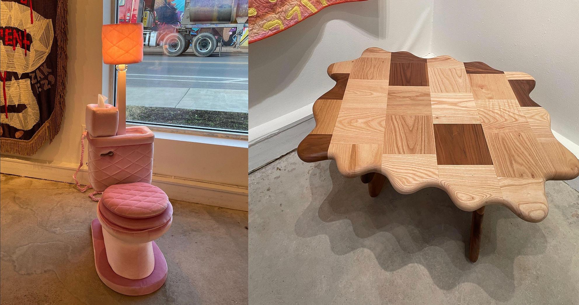 Back on the topic of blurred lines, there is Jenna VanFletern’s Soft Stool, which greets visitors upon entering the gallery. Essentially a lamp and stool, the sculpture is composed of fuzzy pink fabric stuffed with batting and foam quilted over a wooden structure in the shape of a toilet and complete with a working light fixture. Across the room, the wooden quilt of Zag Wonk from artist Taylor Williams takes the form of a table.