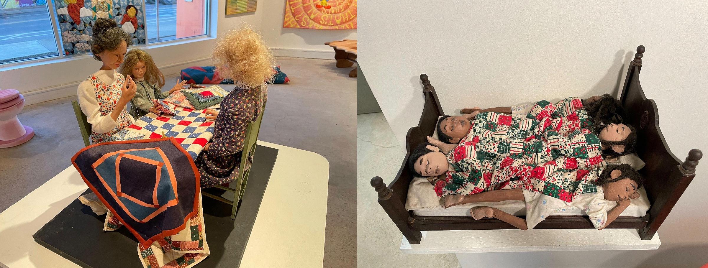 Ludie Amos, who has three works on display, plays with a number of possibilities in her quilts. Her two sculptures, Quilting and Crowded, employ the quilt as more of a character in the storytelling rather than the medium. Both pieces capture the spirit of the traditional quilt: collaborative not only in its making, but in its use over time. Quilting shows three women, seemingly from different generations, in conversation around a quilt in progress. Crowded shows a family of four in bed under a single holiday quilt. Quilts have a tendency to change hands over time, and the process and emotional toil of the quilt-making inform the object as much as the memories of its uses. Amos communicates this beautifully.