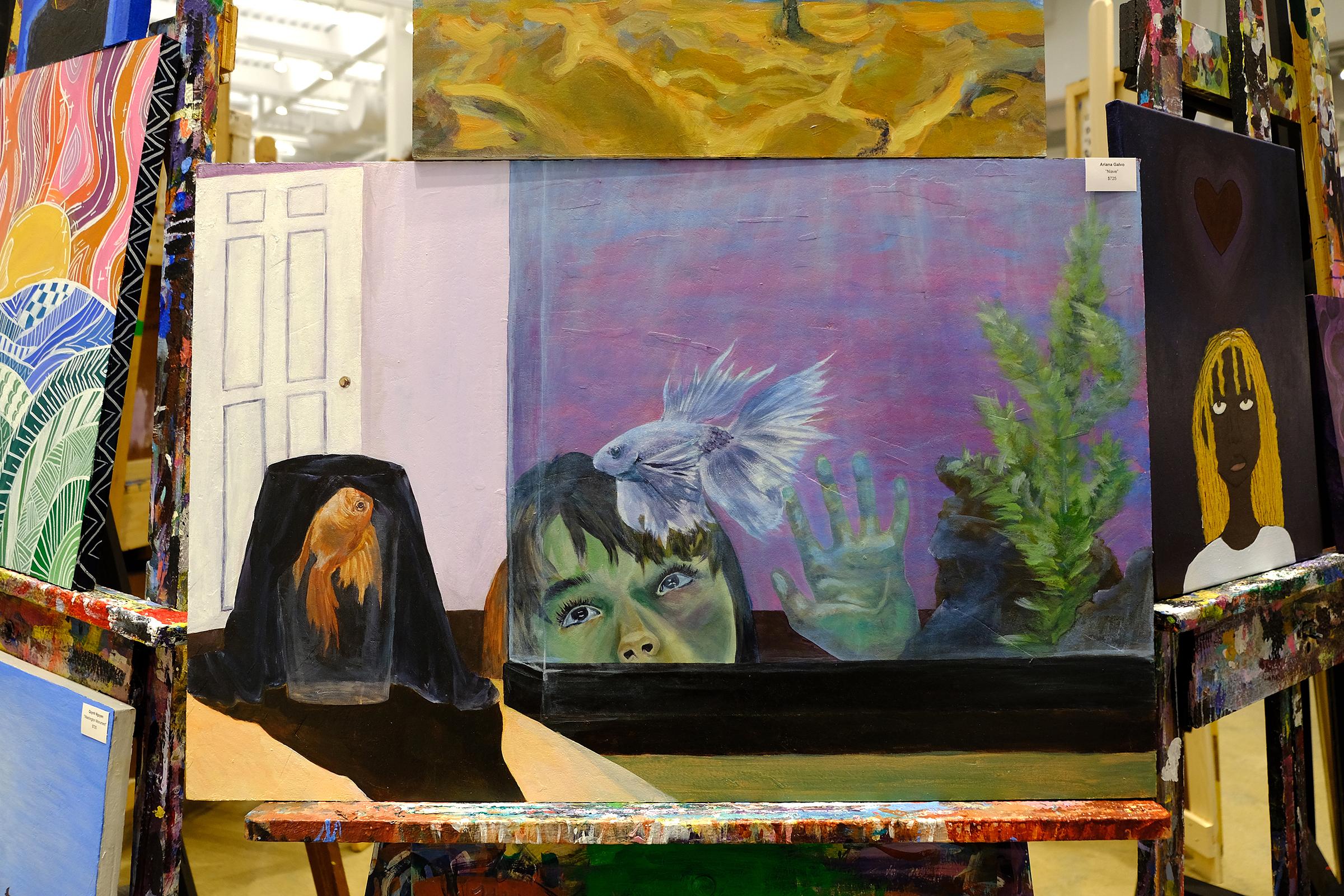 Of course, there were also plenty of pieces that made me do a double-take because of their creativity or execution and think, “oh wait, a teen made that, too?” Rose Christian’s soft and muted painting Nevermore, depicting a young Black girl holding a white bird, felt almost Shakespearean in its drama and poetic resonance. Ariana Galvo’s painting of a young child observing a fish in an aquarium while a seemingly dead fish floated under a black veil in a cup nearby felt like a multi-layered meditation on innocence.