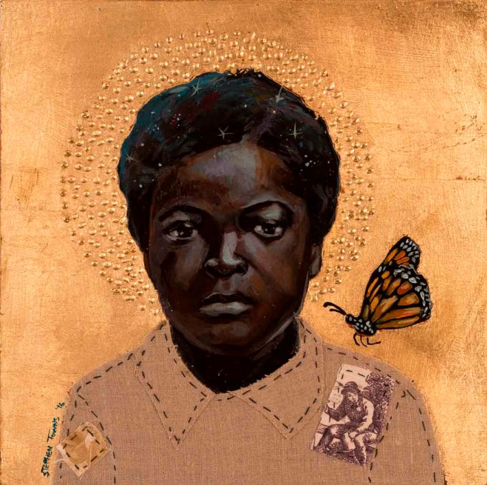 In one series of paintings, Towns depicts enslaved children backed by gold leaf, their heads engulfed in a kind of halo, stars twinkling in their hair. He explained that the stars represent dreams as escapism, the only tool these children had to escape the reality of slavery. They couldn’t revolt, couldn’t fight back—but they could dream.