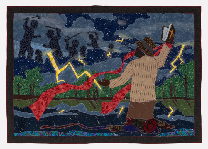 Revolts and uprisings are a recurring inspiration for Towns. After teaching himself to quilt from YouTube tutorials, he embarked on a series of quilts telling the story of Nat Turner’s Rebellion, an infamous insurrection of enslaved people led by the preacher Nat Turner in Virginia in 1831. The rebellion resulted in the deaths of over 50 white people, making it the deadliest slave revolt in American history. In this series, Towns tells this story from the beginning, quilting Nat Turner as a young boy learning to read, performing baptisms as a young man, standing under a solar eclipse and taking it as a sign from God that he was meant to be free. The quilts use color blocking to frame Nat Turner as a saint, projecting fluid movement through textiles.