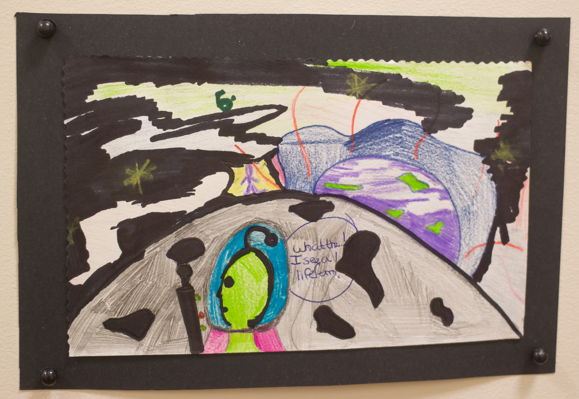The art at Monday’s show ranged from photography to ceramics to painting and beyond. A super up-close photo of a squirrel by artist G.C. put the fuzzy creature on equal footing with the viewer, making it feel like a friend. A science fiction comic from B.N. took viewers all the way to planets Zorg and Zars in the year 3025. A solid red heart drawing by F.J., with his name scrawled elegantly on the upper left, said all that was needed to be said.