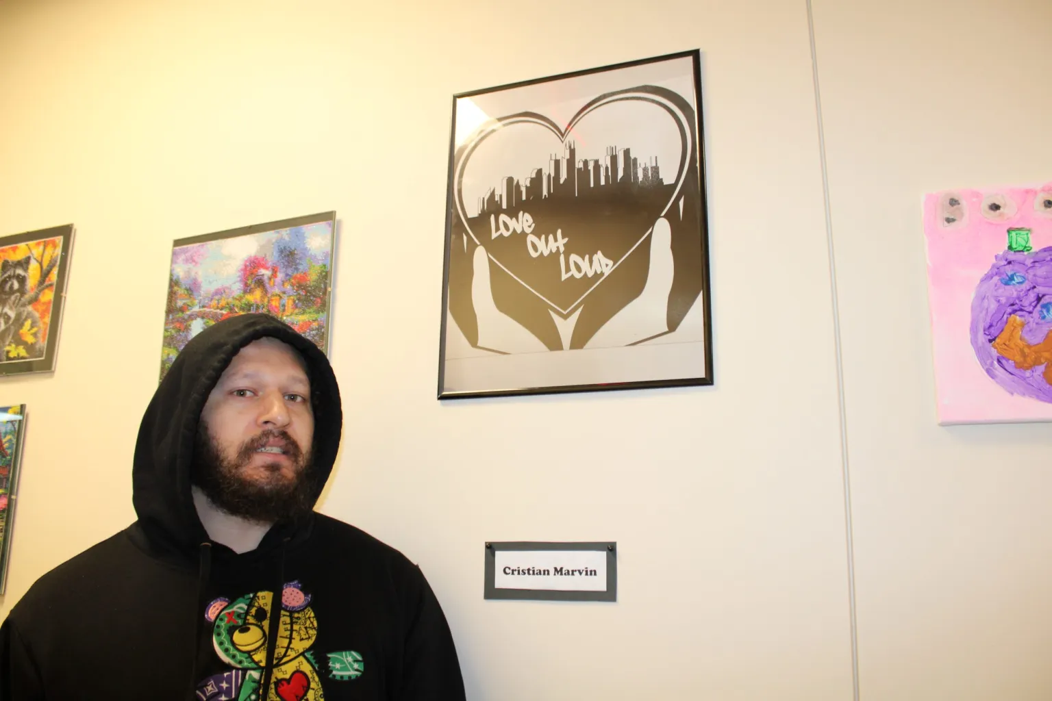 The exhibit, filling a hallway on the first floor of Continuum of Care’s 109 Legion Ave. offices, was an extension of an art club Onorato piloted when he first joined the Health and Wellness team. As a whole, the organization works to provide case management, crisis care, and housing support to its clients. The Health and Wellness team works to bring clients out of their shells and discover new parts of themselves, and Onorato’s art club served as a way to provide these encouragements in a low-pressure environment.