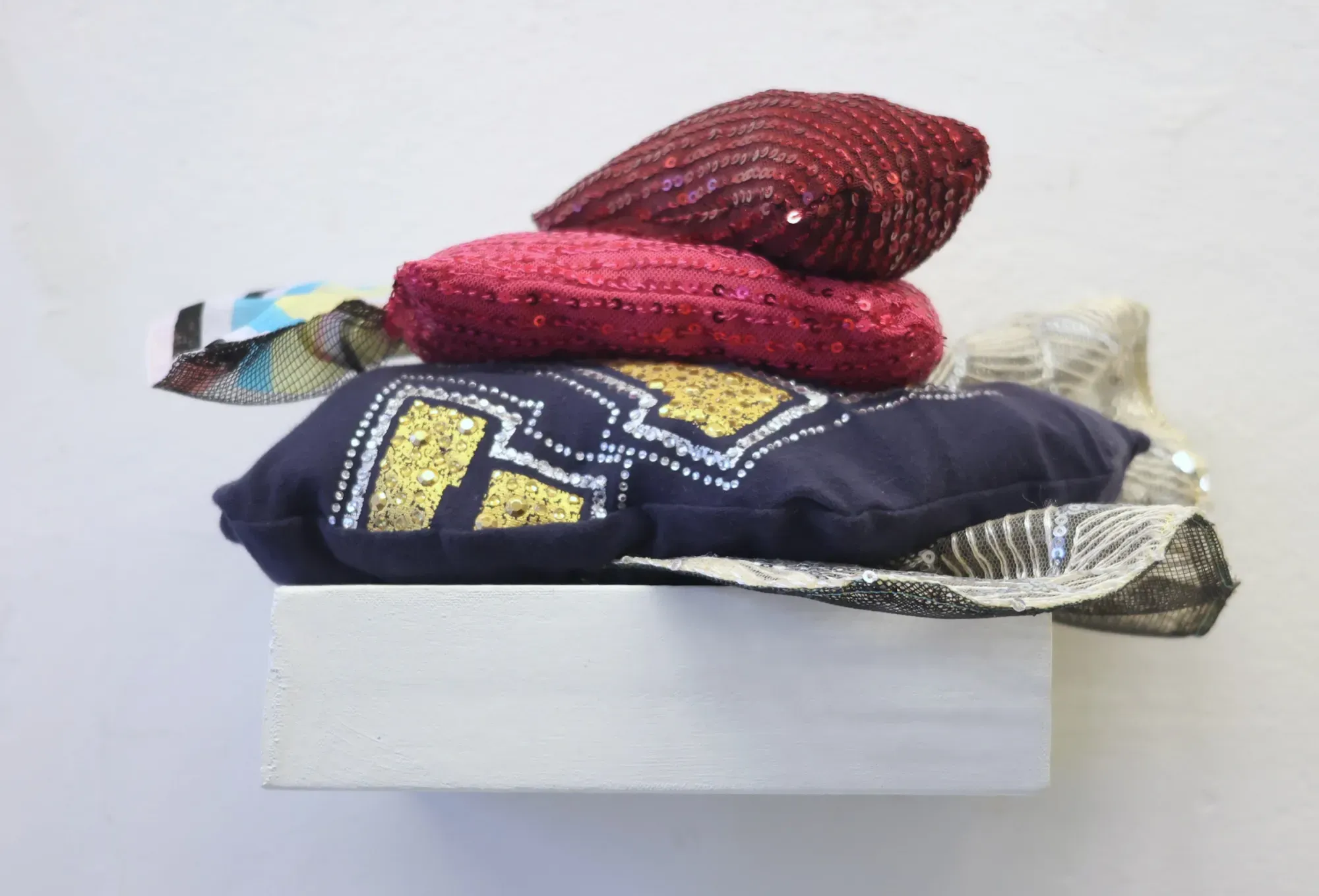 Other groupings of artists create pieces that, taken together in the show, feel like ephemera from an alternate reality. The title of Kathryn Frund’s Sandbag Grouping 2 forces the viewer to think a little differently about the brightly colored miniature throw pillows on display. If they’re sandbags, what frivolous yet dangerous flood are they stacked to contain? Maria Markham’s Ráth — the Old Irish word for a circular earthwork — combines stitching and grainy photography to create a moody image evocative of a folk horror movie.