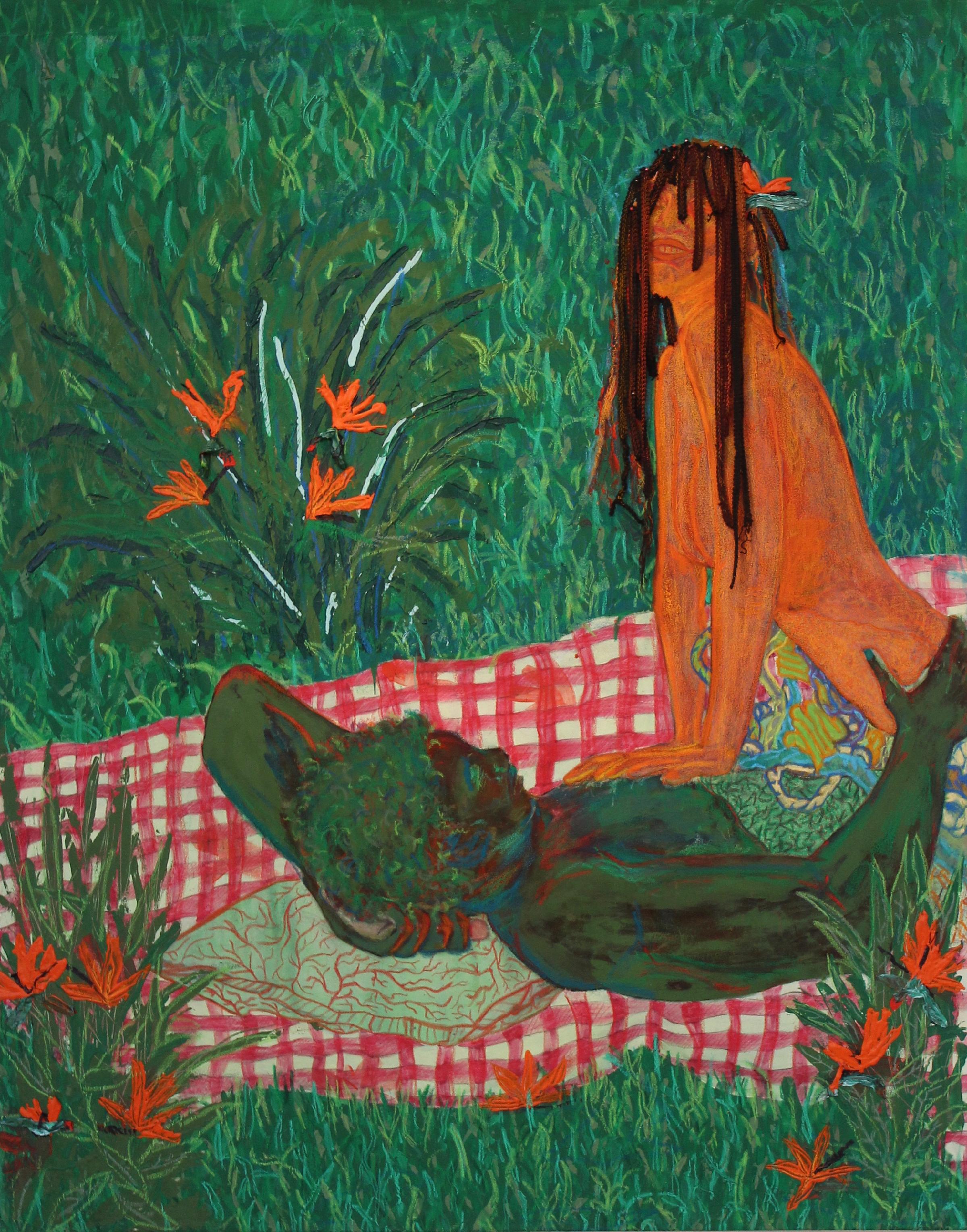 Meanwhile, MO’s painting, vibrating with vivid colors, frankly sexual, and possibly exhibitionist — the lovers are on a blanket in what could be a park — imagines a world, in the end, of dramatic acceptance, of celebration of ourselves and others and what we can do for (and with, and to) one another. MO’s matter-of-fact depiction suggests that this world isn’t so far away from the one we currently live in, and that acceptance and artmaking to some extent go hand in hand. They both involve first letting down your guard.