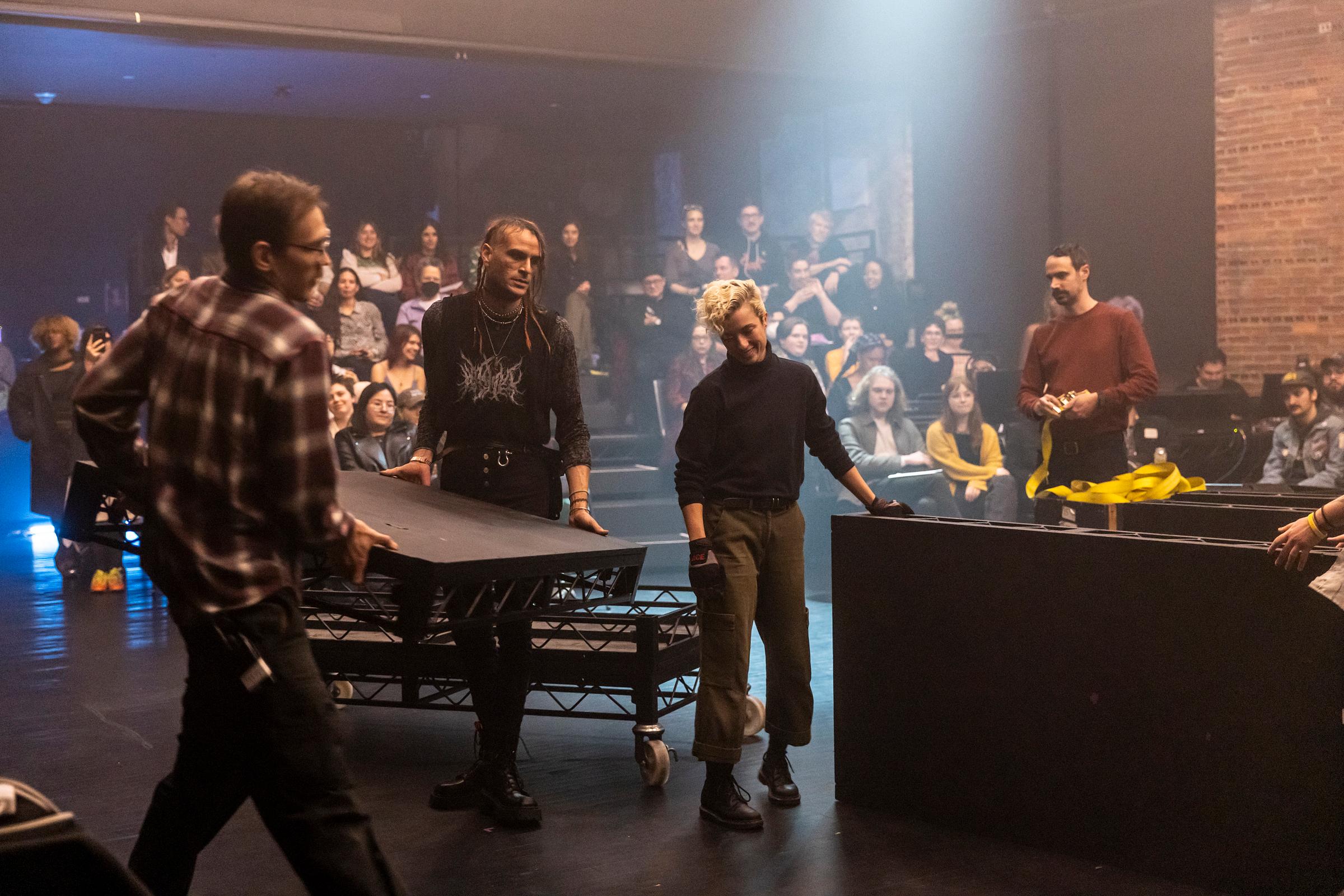 “This is a crew space!” Andy Sowers, Performance Space’s production manager, announced the start of that first performance. Normally just a safety warning denoting an active work zone, the words took on a new and special meaning: Here, at least for one night, the each member crew was the featured artist, the special guest, the VIP they had become so used to supporting, often invisibly and silently. In my reviews, I do my best to uplift the contributions of designers, crew, and less-cited production staff, and in this rare and fun case, there were nothing but.