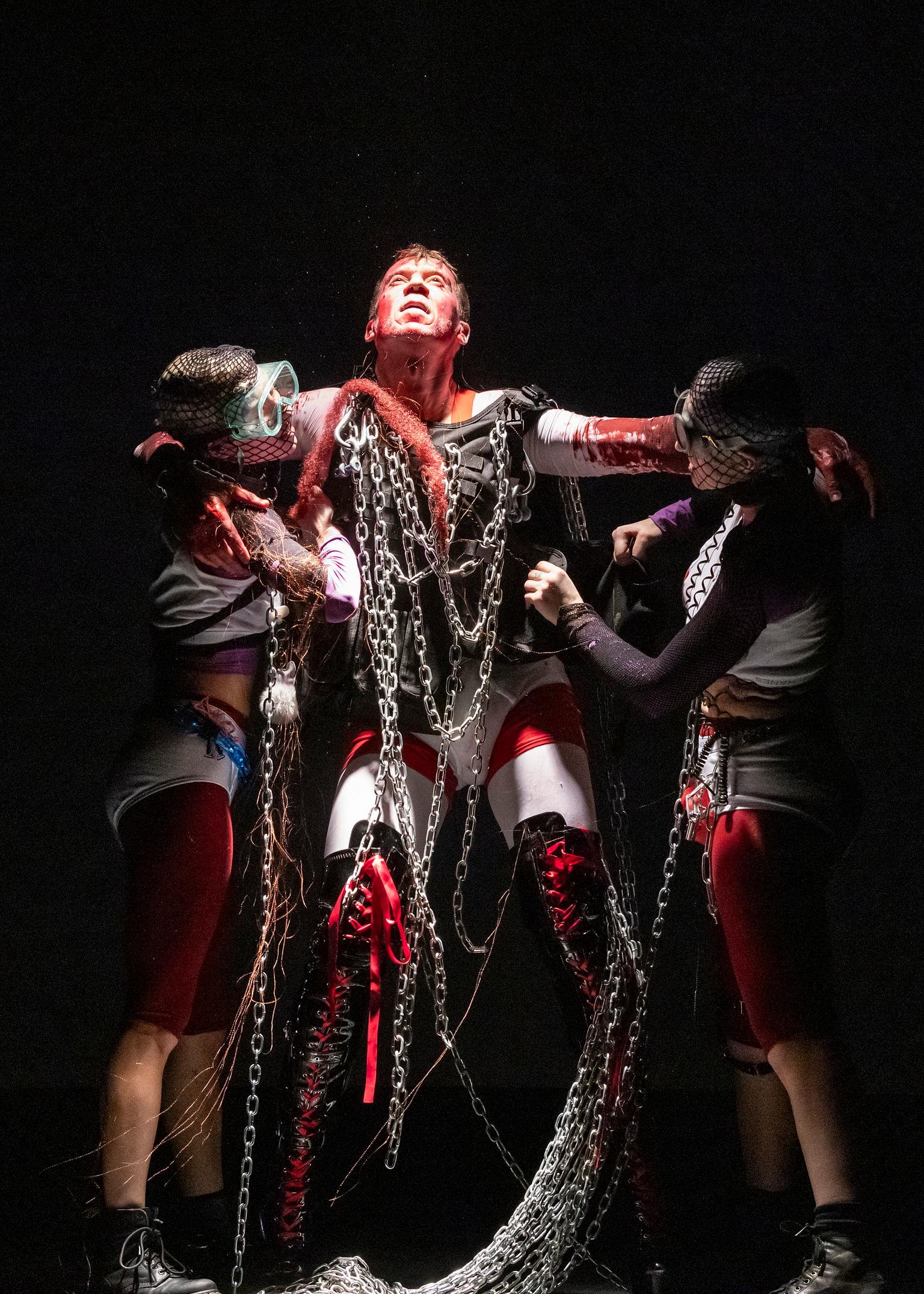 Right after mini load-in was complete and Frazier gave a rousing welcome speech to us, the stage went dark. A door near the back of the theater opened. There was the sound of chains dragging across the floor, bells tolling through the speakers, and a disturbing thumping gradually moving closer to us. Trying to describe exactly what happened next is difficult: Imagine an evil, exhilarating, post-apocalyptic drag performance led by Žilvinas Jonušas, which then turned into a campy, over-the-top rendition of “Willkommen” from Cabaret. I was transfixed by the insanity, absurdity, and intense physicality of Jonušas’ piece.