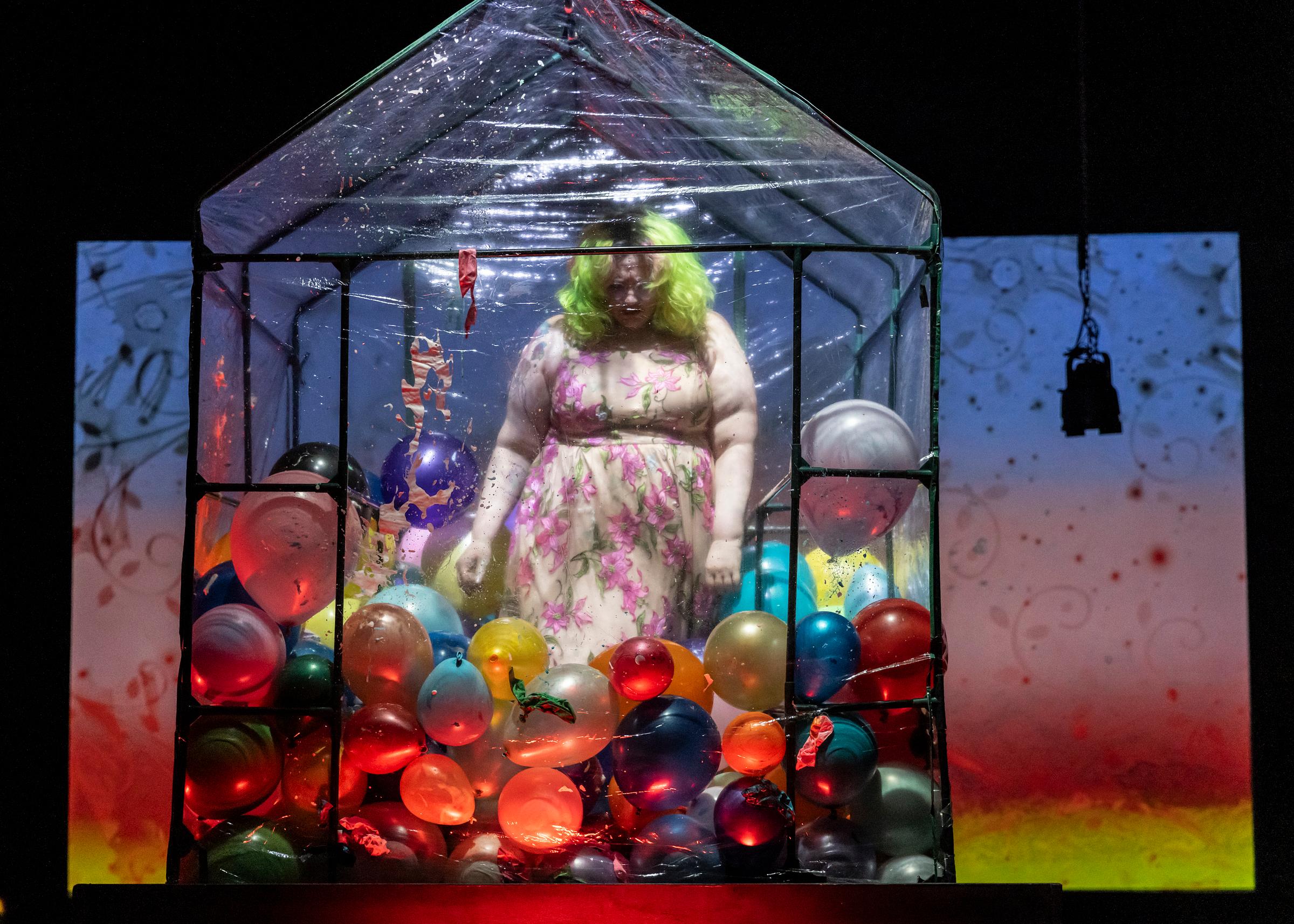Later in the night, during a piece called Untroubling by Matthew Deinhart and Sara Vandenheuvel a large, raised, house-shaped structure filled with balloons that had been ominously sitting upstage was finally wheeled downstage in front of the audience. At the start of this performance, Sara, who regularly does costume design, was the star, and seemingly “trapped”, neck-deep in the balloons inside the enclosure. In a gradual, somber progression, Sara was eventually able to free herself by popping balloons, one by one, until only she remained in the enclosure, along with some kind of lotion‑y residue that was inside the balloons. The act of opposing balloons seemed to elicit mixed emotions; sometimes the act of freeing oneself from a situation means leaving things behind, which can hurt even if it’s the right and necessary thing to do. That’s what I was thinking about as I watched the unusual ballon-popping piece, at least.