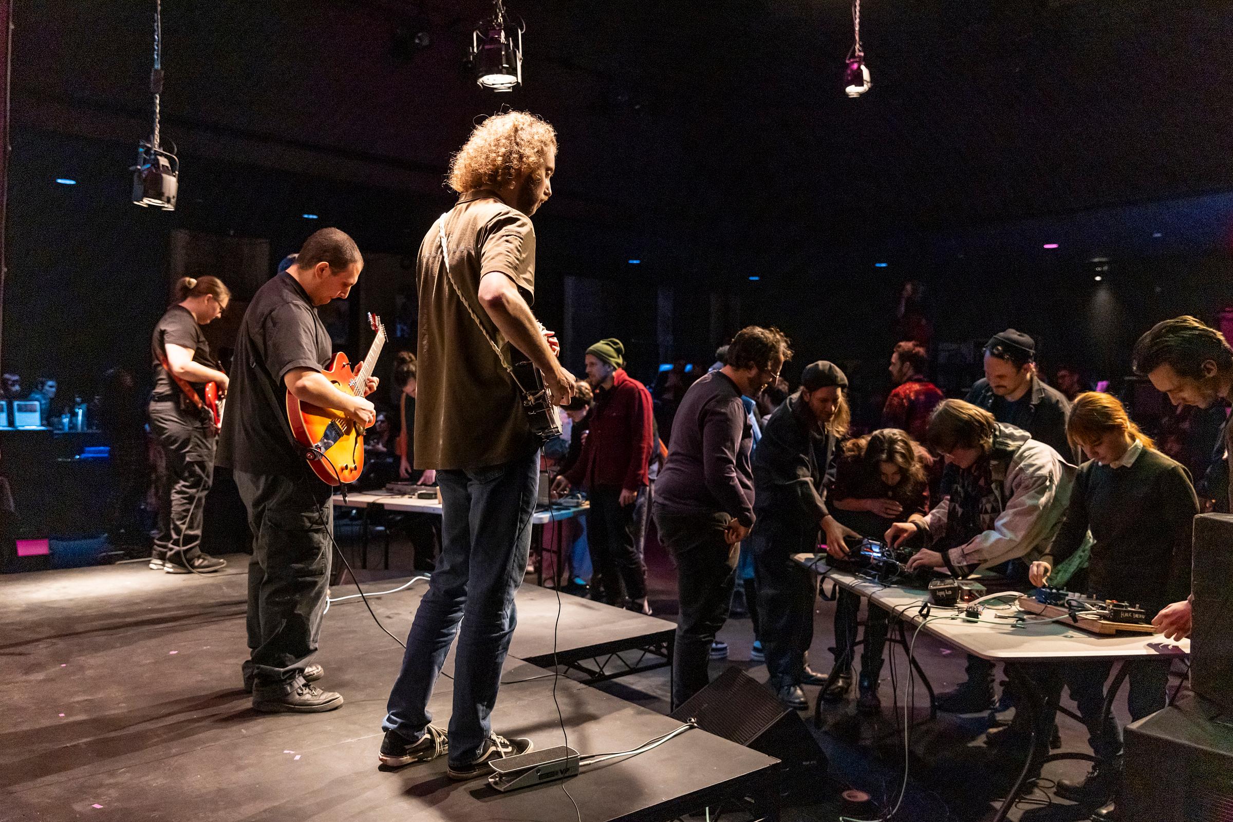 During intermission, a few folding tables were set up in front of the stage with a wide variety of audio equipment and gadgets: effect pedals, synthesizers, and all sorts of knobs and switches whose functions are known only to the wizards we know as audio technicians. At the start of the next act, titled What’s this one do by “Jimmy Kavetas and Friends,” the techs-turned-performers did something I’ve never seen before in my life: we, the audience, were asked to come fiddle with all the equipment on the table to our heart’s content, with no instruction. Once again, one of my worst production nightmares was turned into a gold mine for experimental performance, thanks to the ingenuity of Kavetas and his band, who played their own instruments onstage to flexibly accompany whatever auditory madness we were creating from the audience.
