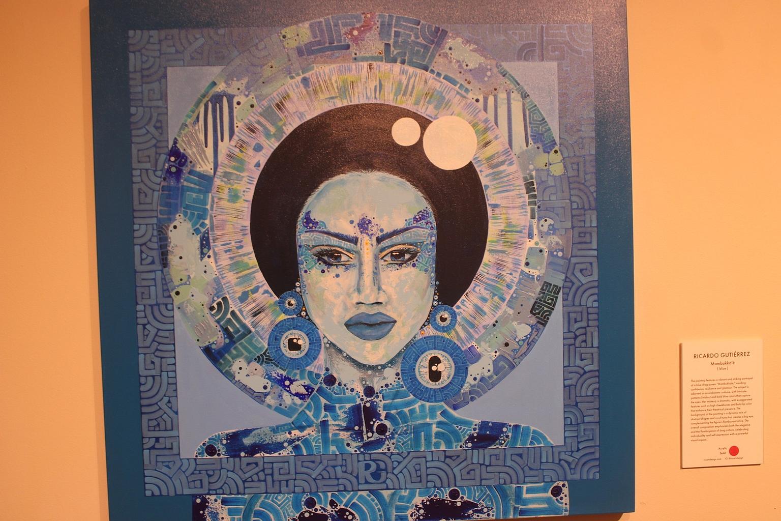 My favorite piece of the exhibition is Mambukkale, by Ricardo Gutierrez. He takes the color blue, and instead of leaning into the melancholic qualities of the shade, he instead creates a piece that is celebratory of drag and its ornate stylings. The most striking aspect of the piece are Mambukkale’s eyes, which stare straight back at the viewer with ferocity and confidence. The globes around the queen’s face also look like eyes, although more circular than the almond shaped and contoured eyes on her face. The large eye behind Mambukkale serves as a portal into the world of drag, where participants find strength in the expression of femininity and beauty. Mambukkale is not a real person, but the skill which Gutierrez used to evoke her on the canvas gives her a life that rivals any flesh and blood person.