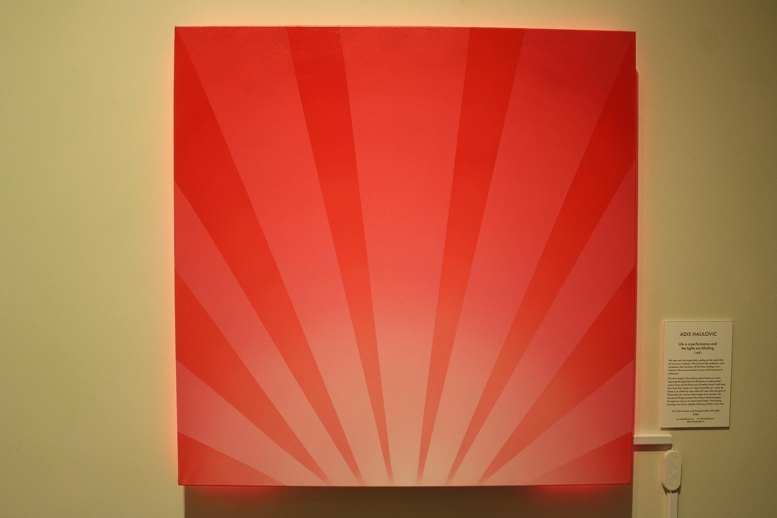 On the other end of the spectrum (figuratively speaking, of course) is Life is a performance and the lights are blinding by Adis Halilovic. The piece is a straightforward display of lights shining from a central point on the horizon. The painting seems to be saying two different things, depending on which color the viewer perceives as the dominant rays of light.