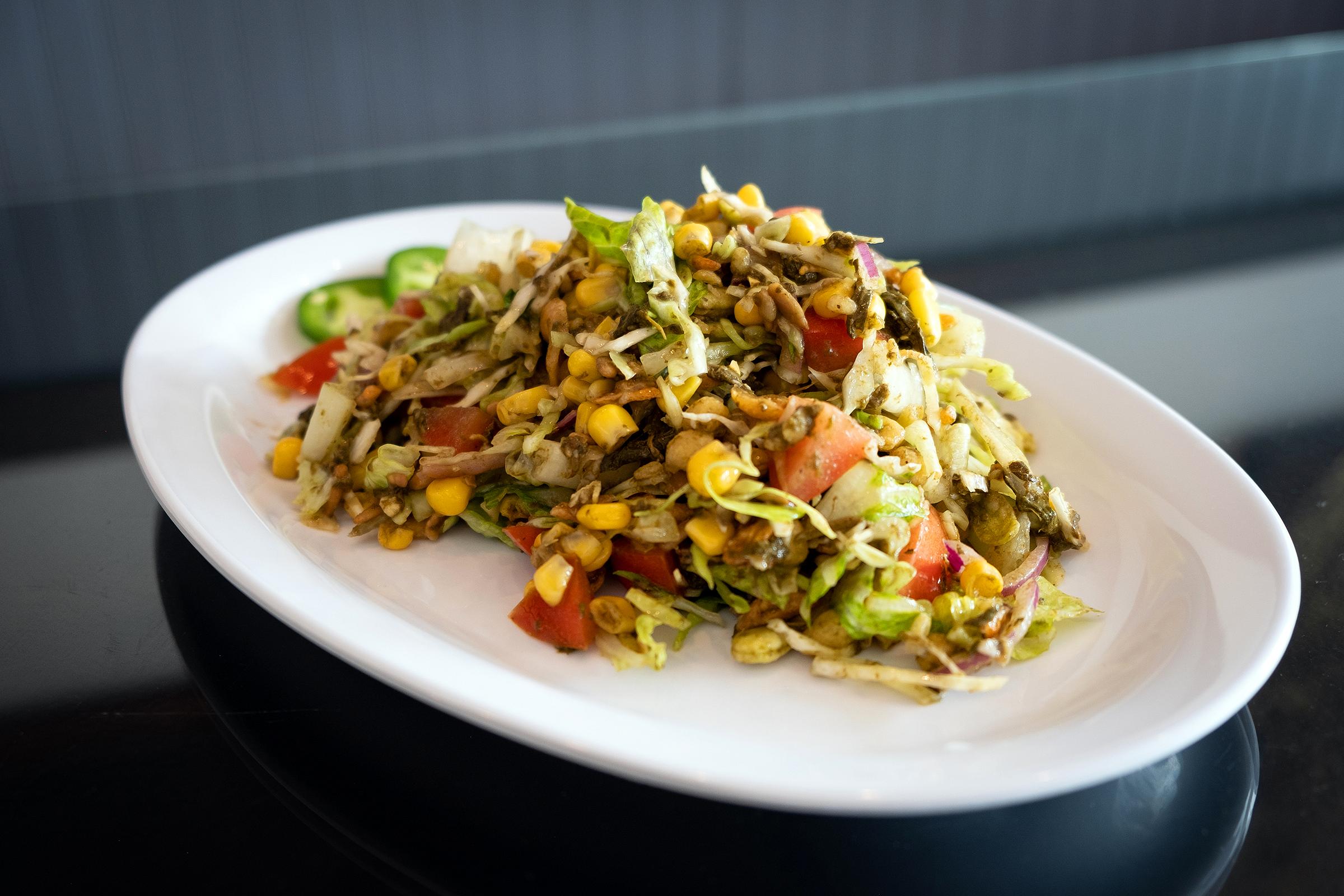 The Pickled Tea Salad (pictured above) is a mouth-pleasing texture combination of crispy fresh veggies and crunchy toasted toppings. A light but distinct tangy pickled note shines through from the tea leaves, providing all of the flavor and dressing that the salad needs. Note that while the portion is generous, this is still very much light fare. For a more filling meal, it would be worth ordering some plata. (A guest at a neighboring table had some, and it looked and smelled divine!)