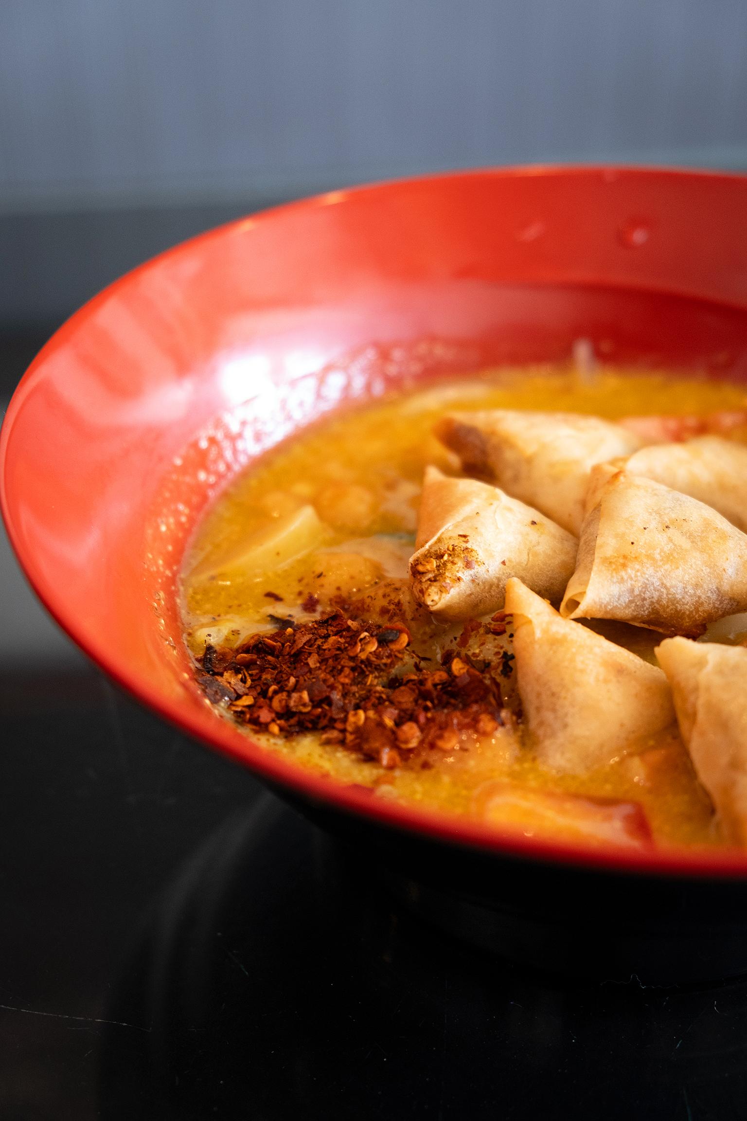 Spice Mountain is described on the menu as “Crispy samosas in chickpea and potato creamy broth, harmonious veggies, and spices.” It delivers exactly that; a bodied and flavorful curry broth with creamy chickpeas and potatoes, a small mountain of expertly crisped tiny potato samosas, and a generous sprinkle of fresh lettuce and cucumbers, which brought brightness to an otherwise rich dish. Optionally, you can stir in some chili powder, which adds heat and accents the rich flavors of the curry broth, or you might even go for the house-made chili crisp!