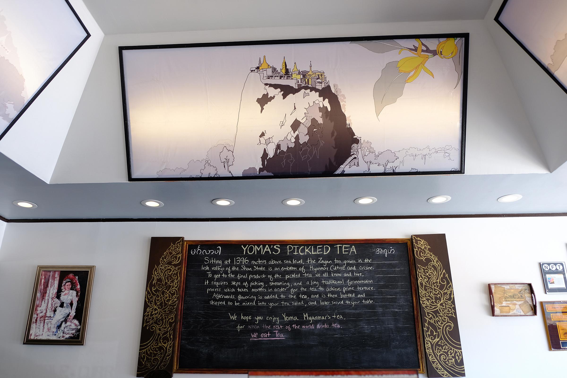 On a bustling corner in the heart of Boston’s Allston Village neighborhood, behind an unassuming storefront, its door flanked by two tidy cafe tables, stands Yoma Burmese Cuisine. Despite the small, dark exterior, Yoma opens up into a surprisingly bright and open interior, its raised ceiling with large illustrations of mountains, temples, and landscapes lending a sense of airiness and calm. One wall features line art depicting each step of the tea leaf pickling process. On the opposite wall is situated the focal point; a large blackboard, hand-painted with gold flourishes, and neat handwriting telling the story of Yoma’s pickled tea.