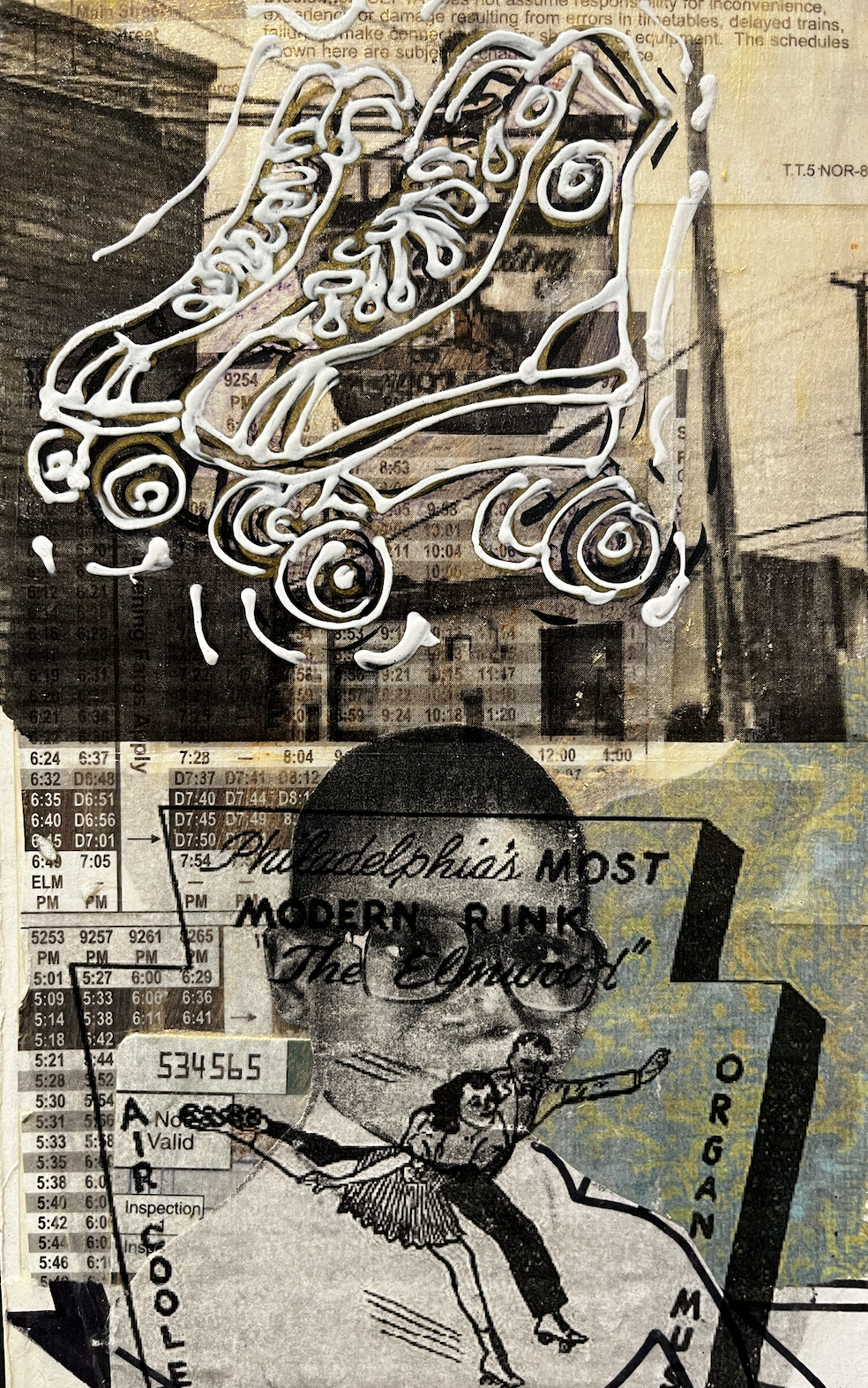 Everett offers personal anecdotes through adjacent journal entries about how these products, in turn, were colored with character by their consumers: “Originally introduced in the 1980s, UNO provided a welcome relief from the humid Philadelphia summers. We often gathered on the steps of my house, where we created our own variations of the game to keep things exciting. For example, forgetting to call 'UNO' resulted in drawing two cards, adding suspense and strategy to our matches.” That background contextualizes his 2023 collage, “Ghetto Uno and cupcakes.”