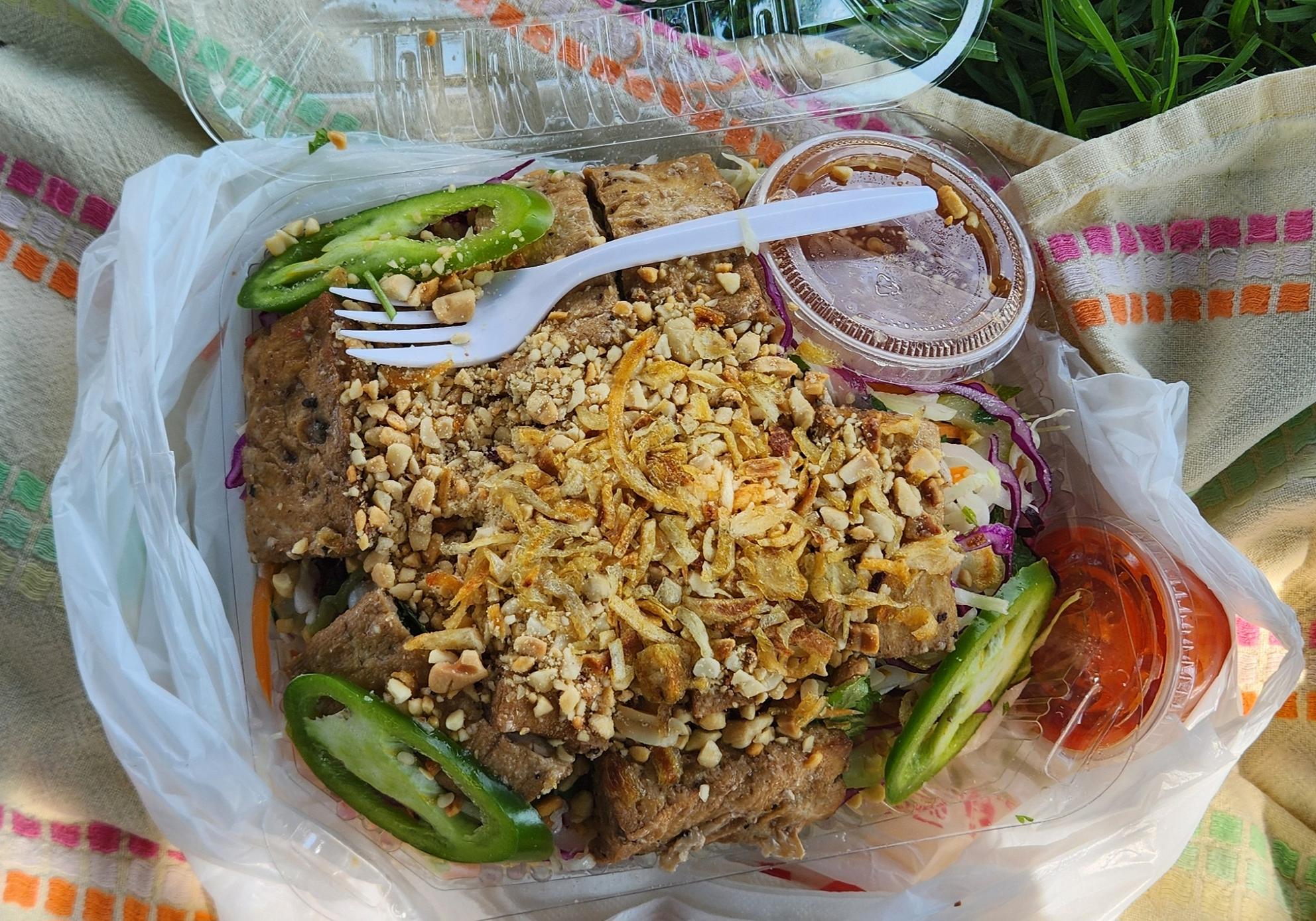 Finally, the Vietnamese tofu salad, a heftier-than-the-fragile-plastic-it-came-in number: a bed of shredded cabbages, more carrot and daikon, and red onions topped with sliced savory and sweet tofu, jalapeño, and crown of crushed peanuts and fried onions. The accompanying dressing was sweet for my taste, but the veggies were fresh and crunchy, the peanuts and fried bits providing some salty umami to temper and disrupt the enormous pile of vegetables. A true whomper, it took quite some time to take down as I tried my best to chew, not just swallow, the juicy shavings. Slurp, crunch, repeat. The tofu was firm but easily fork-cuttable, with dense texture and light sweetness.