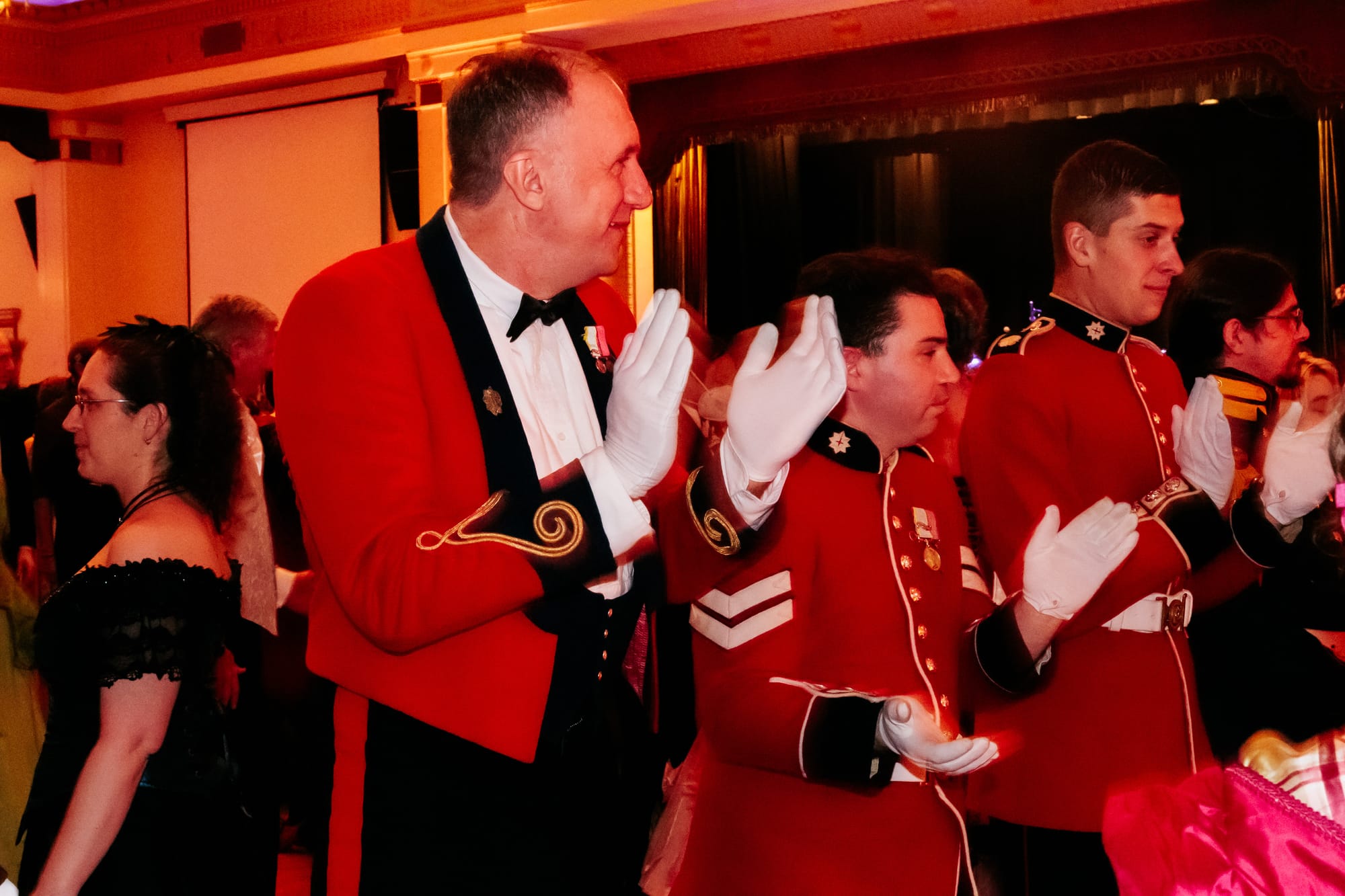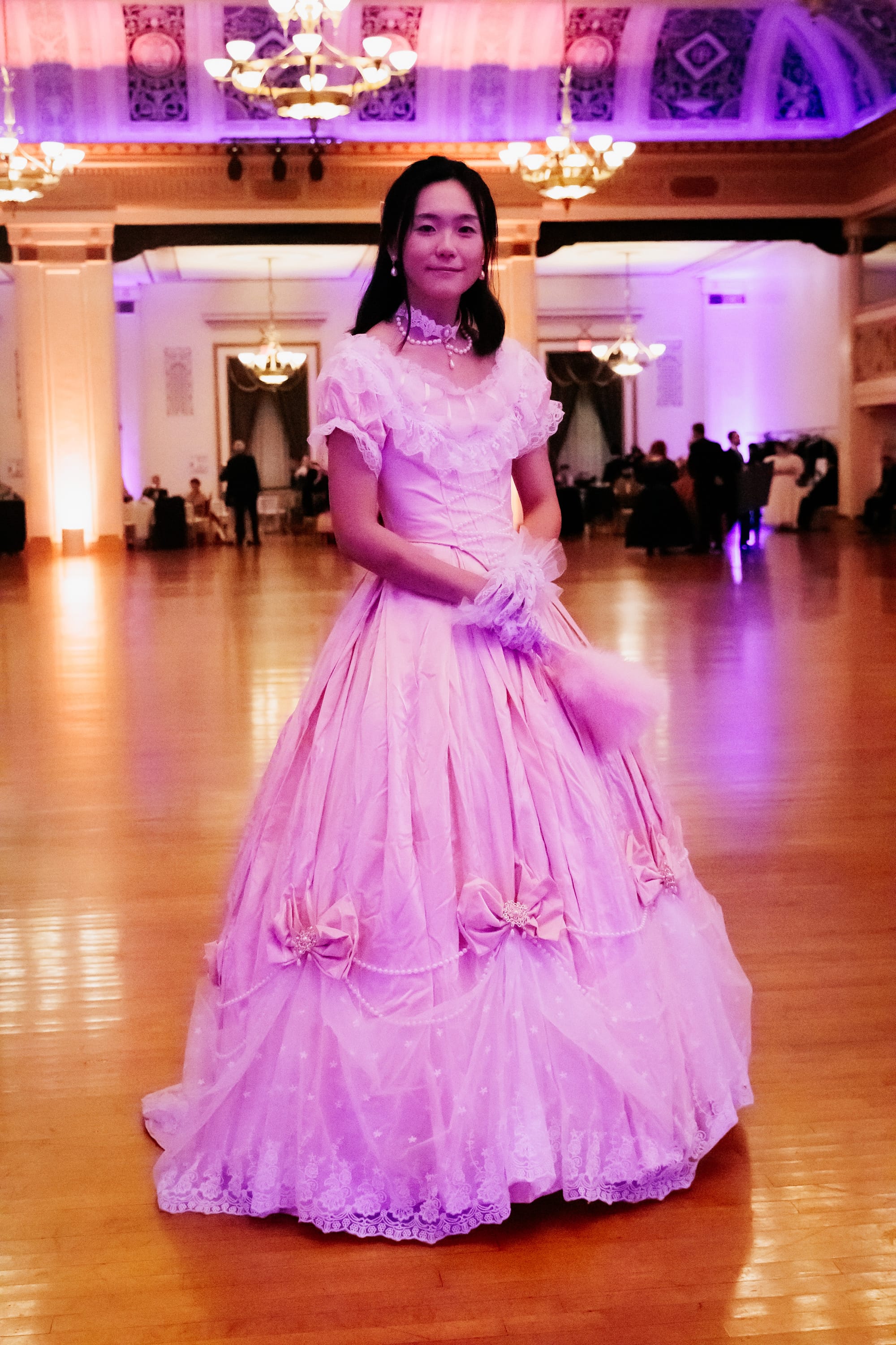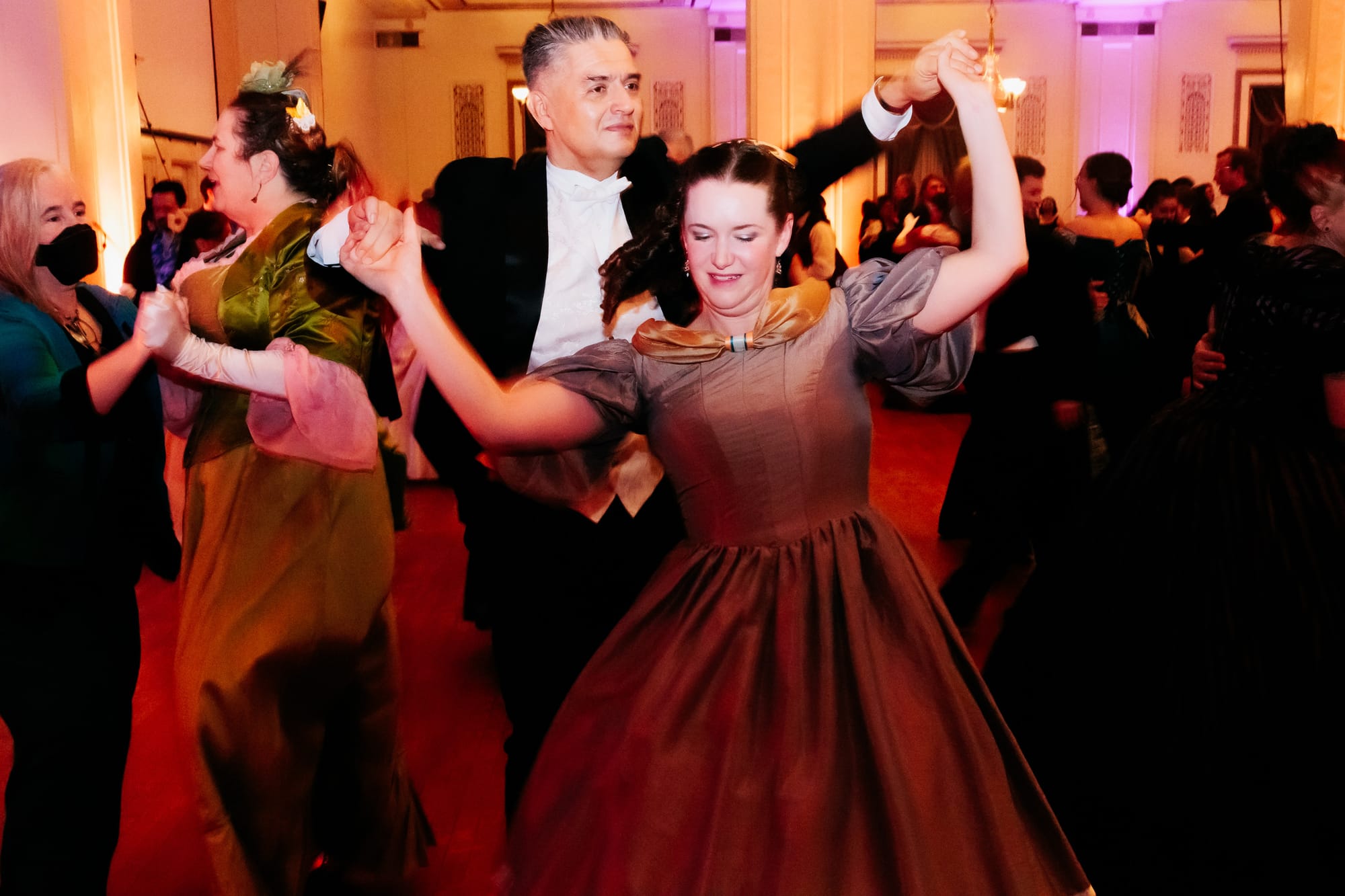 The 600 attendees crowded the dance floor for the Grand March, a sweeping procession that set the tone for the night. The orchestra, Brassworks Band, added to the excitement. Gowns in a kaleidoscope of colors, many with taffeta, stripes, and tartan, floated past the stage, an enchanting spectacle, imbuing the air with elegance and regal joy. For many guests, these gowns were a labor of love, either made by hand or thrifted and lovingly restored, and the night a dancing work of art.