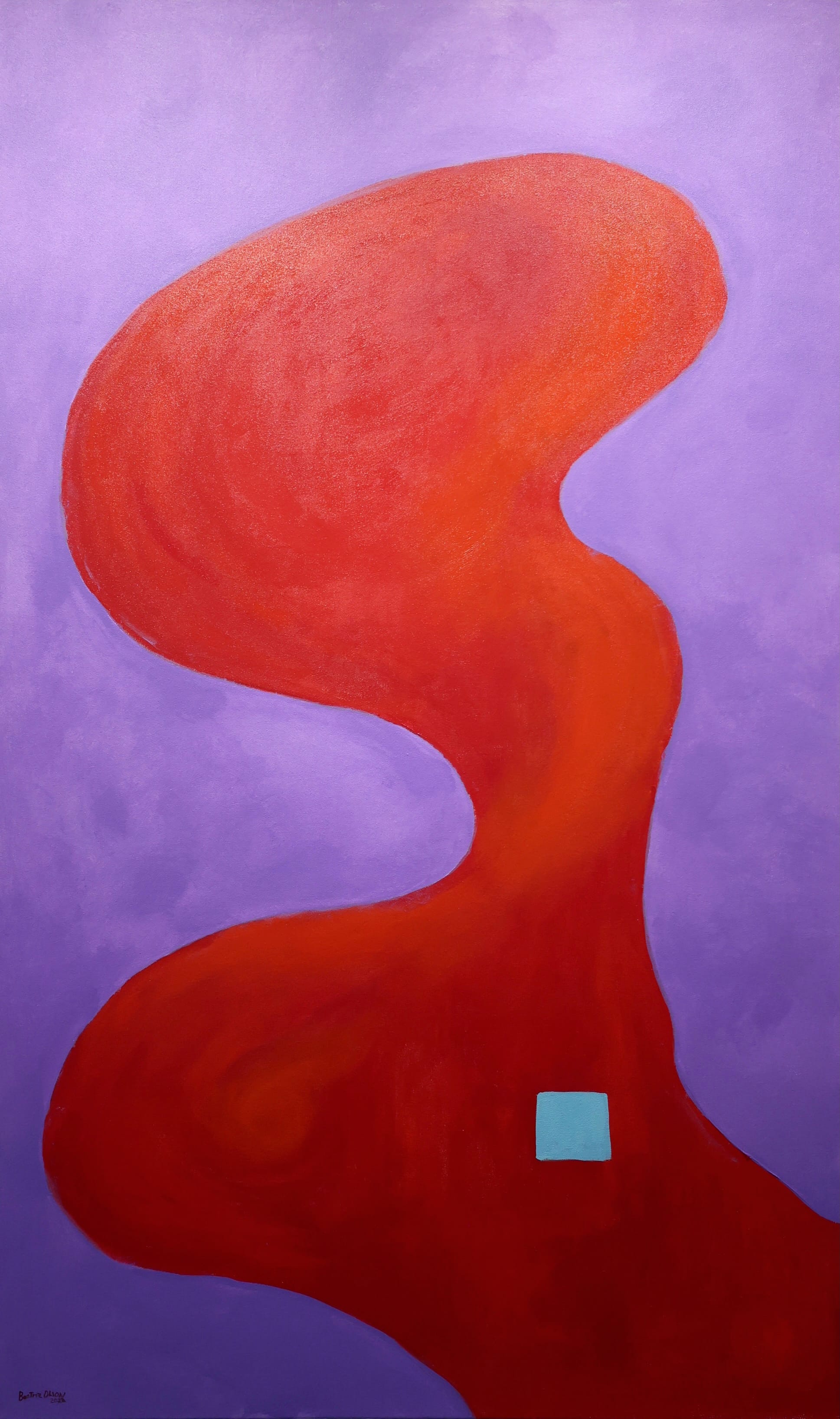 The painting Courage is "about the feminine spirit expressing itself," Olson said, and about "what colors can do to you." To Olson, the abstract form in the painting is a woman, who "wanted to be created, but she didn't want form. It's a pain in the butt when somebody shows up and tells you, 'I want to be here, but I don't know how I want to be." It's the color itself that connotes the courage. "She has a window to the world," and is in "the fullness of who she is" — whoever she is.