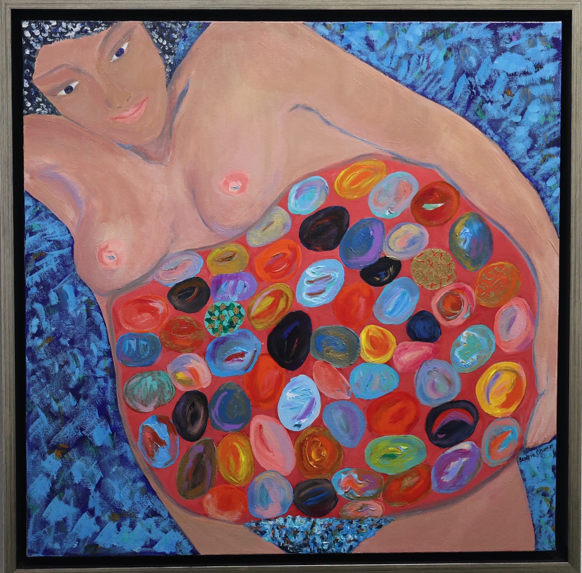 Artist Beatriz Olson pointed to an abstract painting, a series of friendly shapes on a field of blue. "That's my self-portrait," she said, noting that it was the second one she'd made. Her first one, made years earlier, centered on "me as a little girl." She used her passport picture from when she emigrated from Cuba, "and I put myself behind a grate," as if in jail.