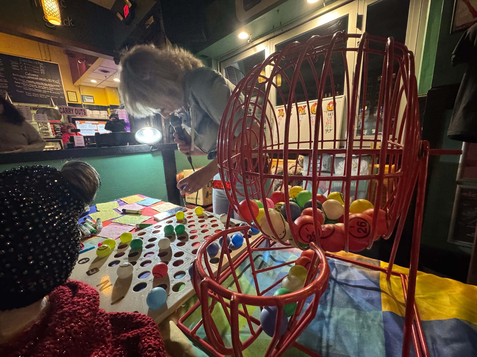 I’ve made the argument that this is closer to a full-on comedy performance than it is a bingo night. But there were cards passed out and those cool paint markers to dot the numbers as Mayor Darlington read out the next ball to the packed house. (It’s nearly standing room only a lot of nights, even in the freezing cold.)
