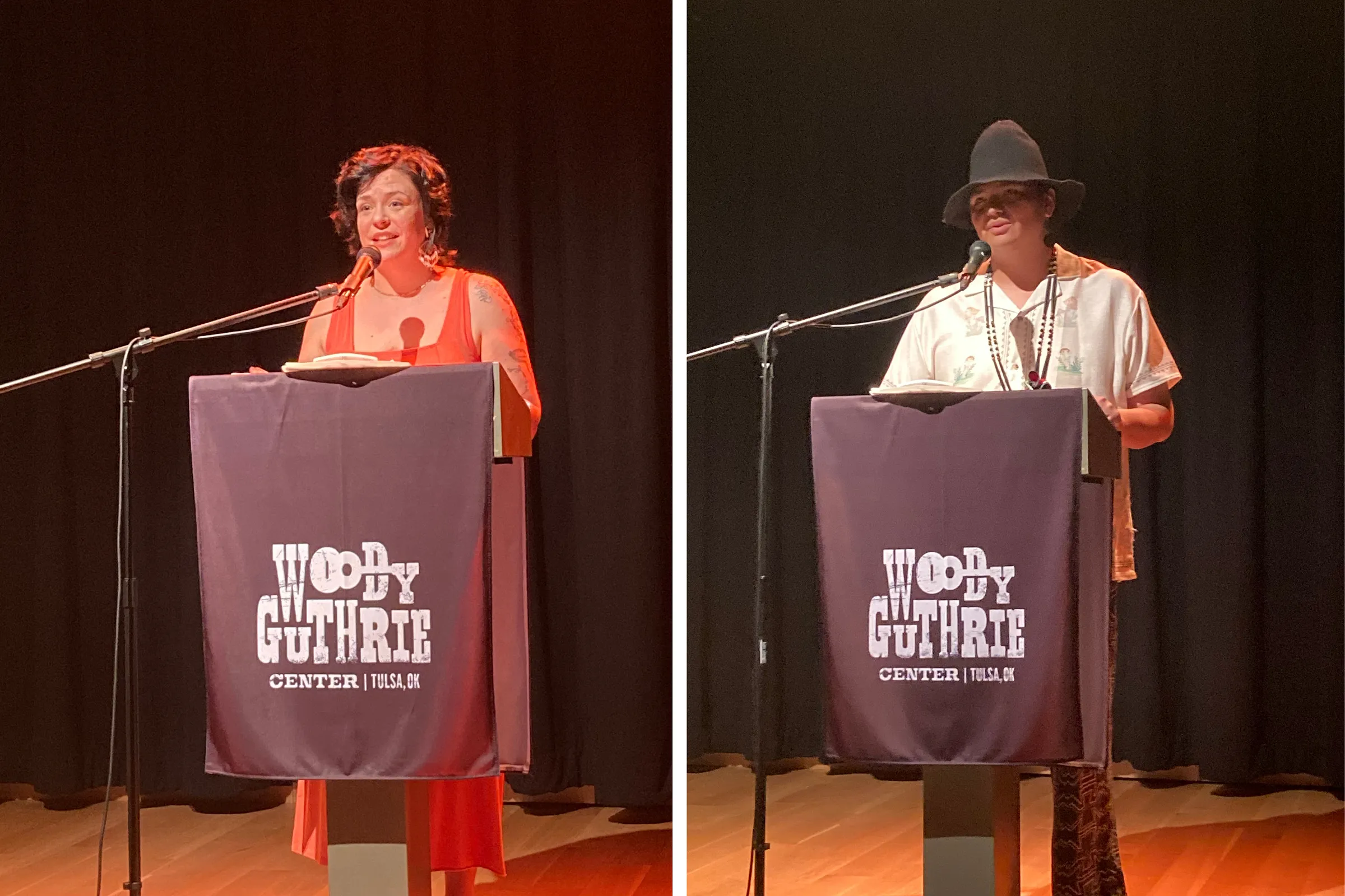 The story in Tulsa this Labor Day weekend was all about the Big Dam Party, and amid the celebration (and lingering questions) about the state of Water in the River, it stands to reason that other happenings in town may have been overlooked. Indigenous Language Poetry Night with Words of the People had additional wrinkles with last-minute lineup changes and technological hiccups. Nevertheless, a few enthusiastic poets and poetry fans ventured out into a rainstorm Saturday night to visit a different gathering place, the Woody Guthrie Center, for an evening that was a call to language reclamation in varying forms and presentations.