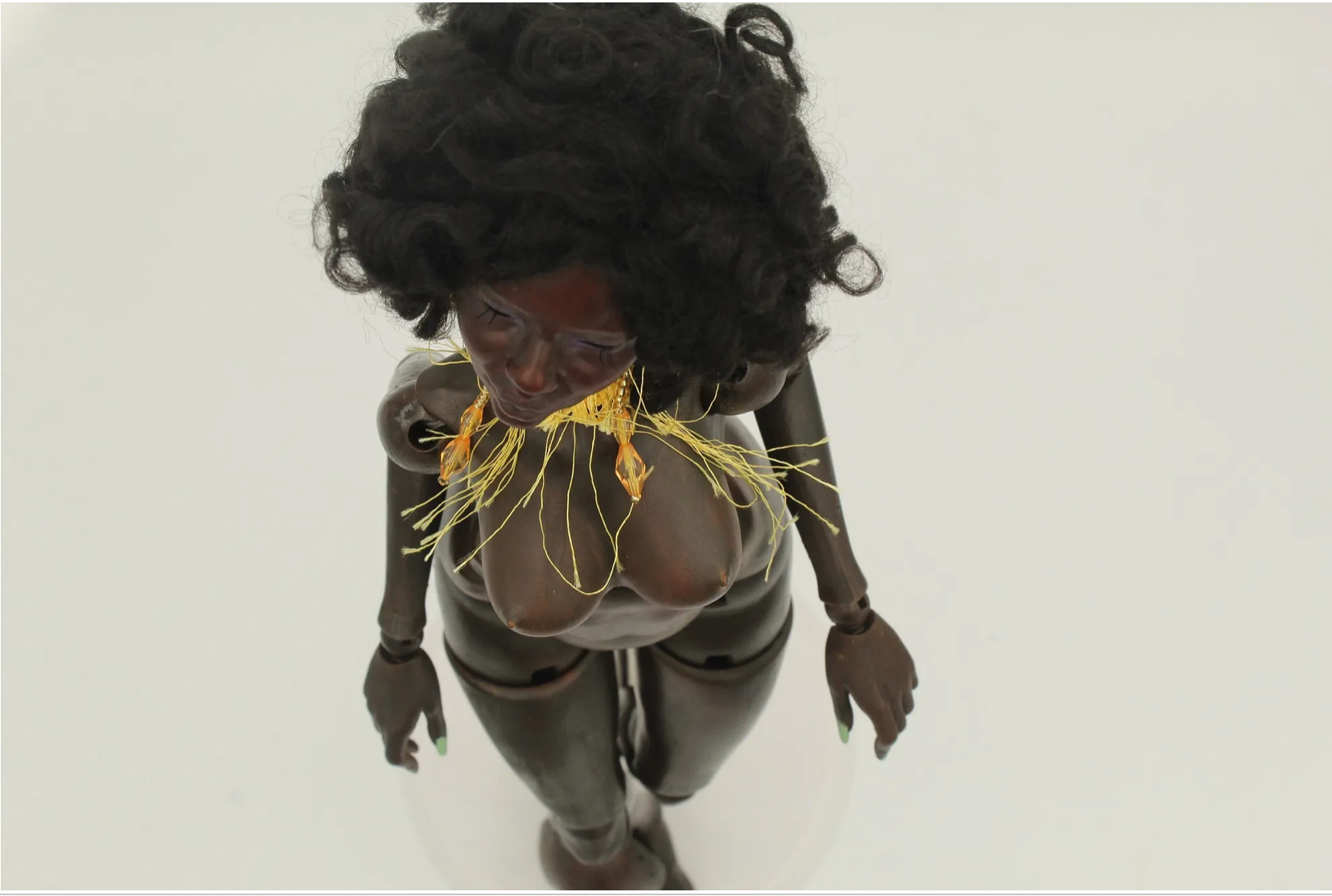Each of the artists has their own motivations for the art they make. “Inspired by the powerful women in her life, Ebony B. Mckelvey’s portraits depict the Black woman’s strength, beauty, and resilience, all while critiquing the society that denies her peace and the ability to be soft,” okoro writes. Demeree Douglas, meanwhile, “sees her own natural hair journey as a source of inspiration in creating these vibrant paintings that celebrate the Natural Hair Movement, which began in the 1960s alongside the Black is Beautiful Movement, and resurged in the 2000s as awareness circulated around the health dangers of hair-straightening chemicals.” Sydney Bell’s paintings offer “an image that quite literally depicts beauty’s residence within both the eye of the beholder and that of the beheld. She reminds us of the power of perspective.” For Alexzandria Robin, “each doll stands as a testament to resilience and transformation. The ball-jointed mechanism itself symbolizes adaptability: the ability to bend, pivot, and re-form in response to life’s shifting circumstances.” And Clymenza Hawkins seeks to depict “WomenFolk, visionaries of their own destinies.”