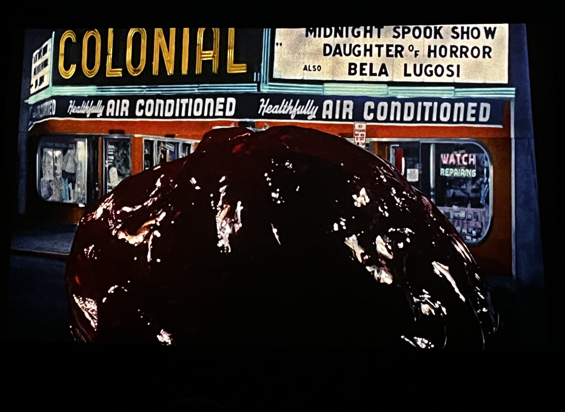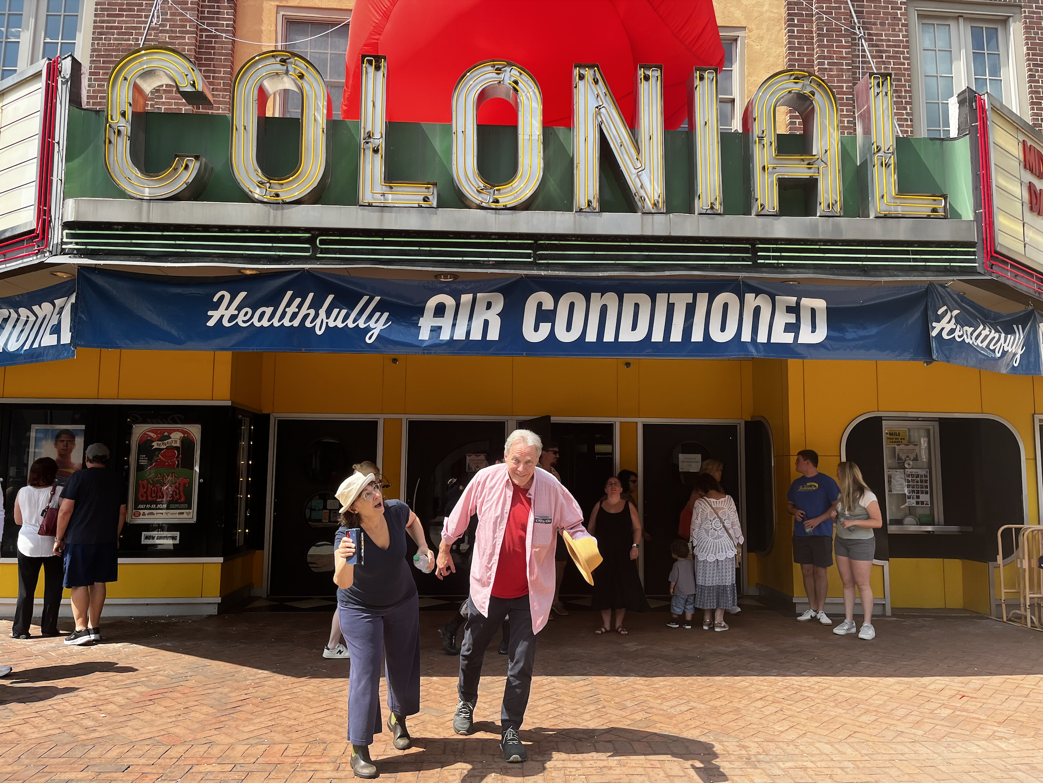 The special screenings at Colonial end with a reenacted “run-out,” where everyone pretends The Blob has returned and race out of the theater. The Sunday matinee skipped this part, but I still got snapshots of my senior parents slow-motion screaming outside the theater, under the classic “Healthfully Air Conditioned" banner that ironically donned the movie set.