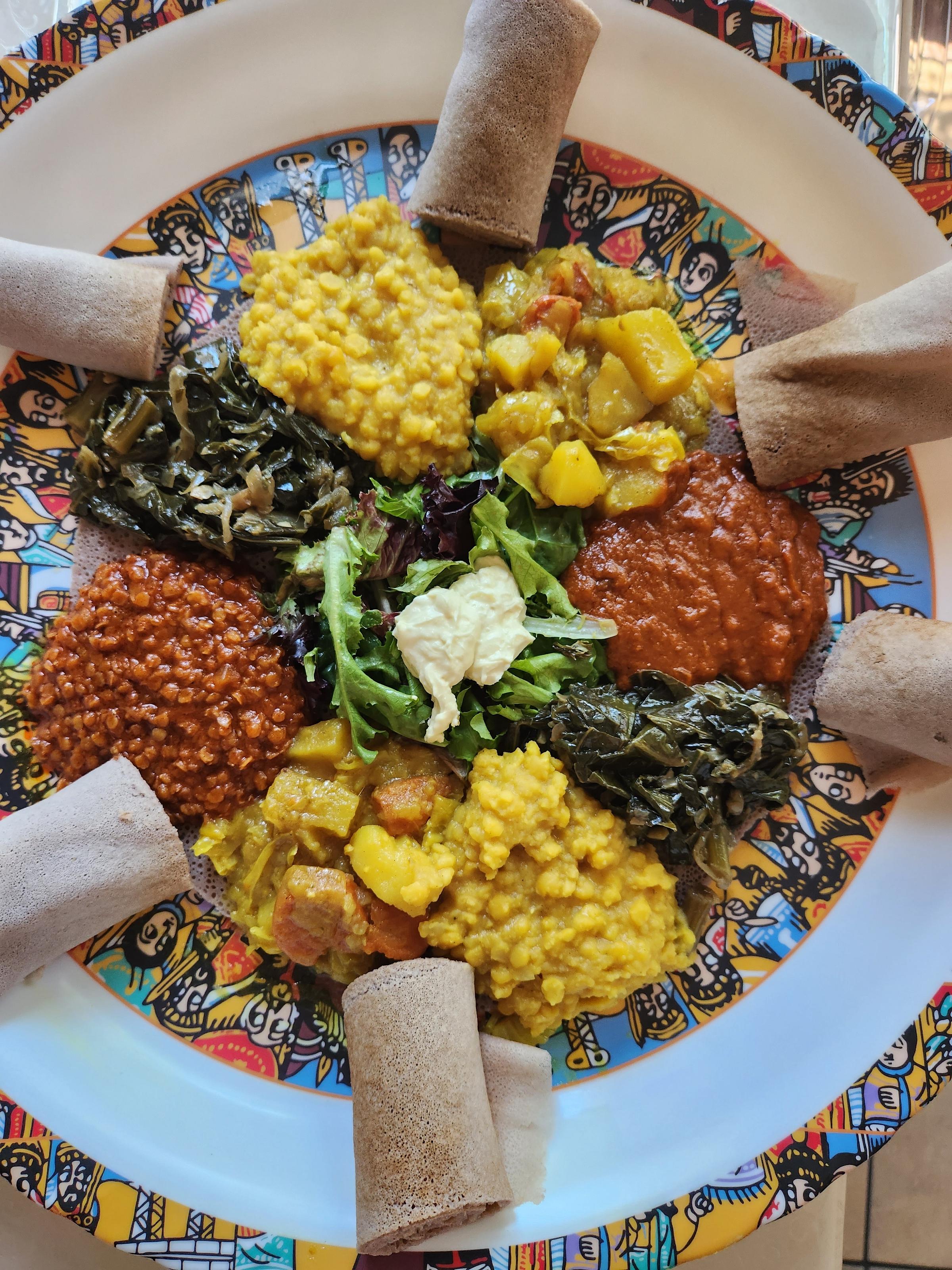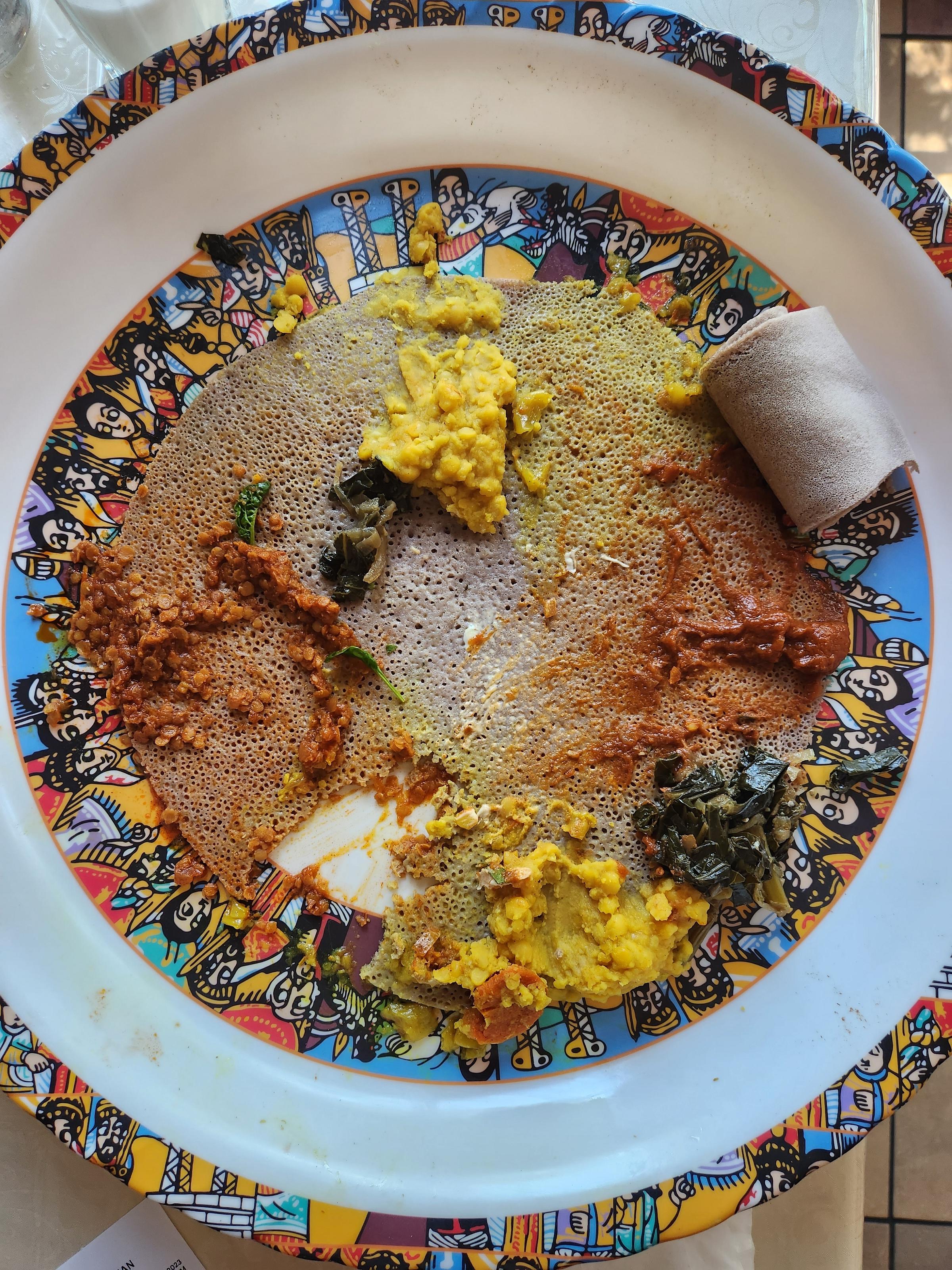 Shortly thereafter we were served an enormous platter with eight gently dolloped dishes and rolls of injera surrounding (pictured at the top of the story). The colors were beautiful, and the range from smooth paste to chewy lentil to soft and supple vegetable, cut by the small pile of salad dressed in a hummus-adjacent cream, appeared just right.