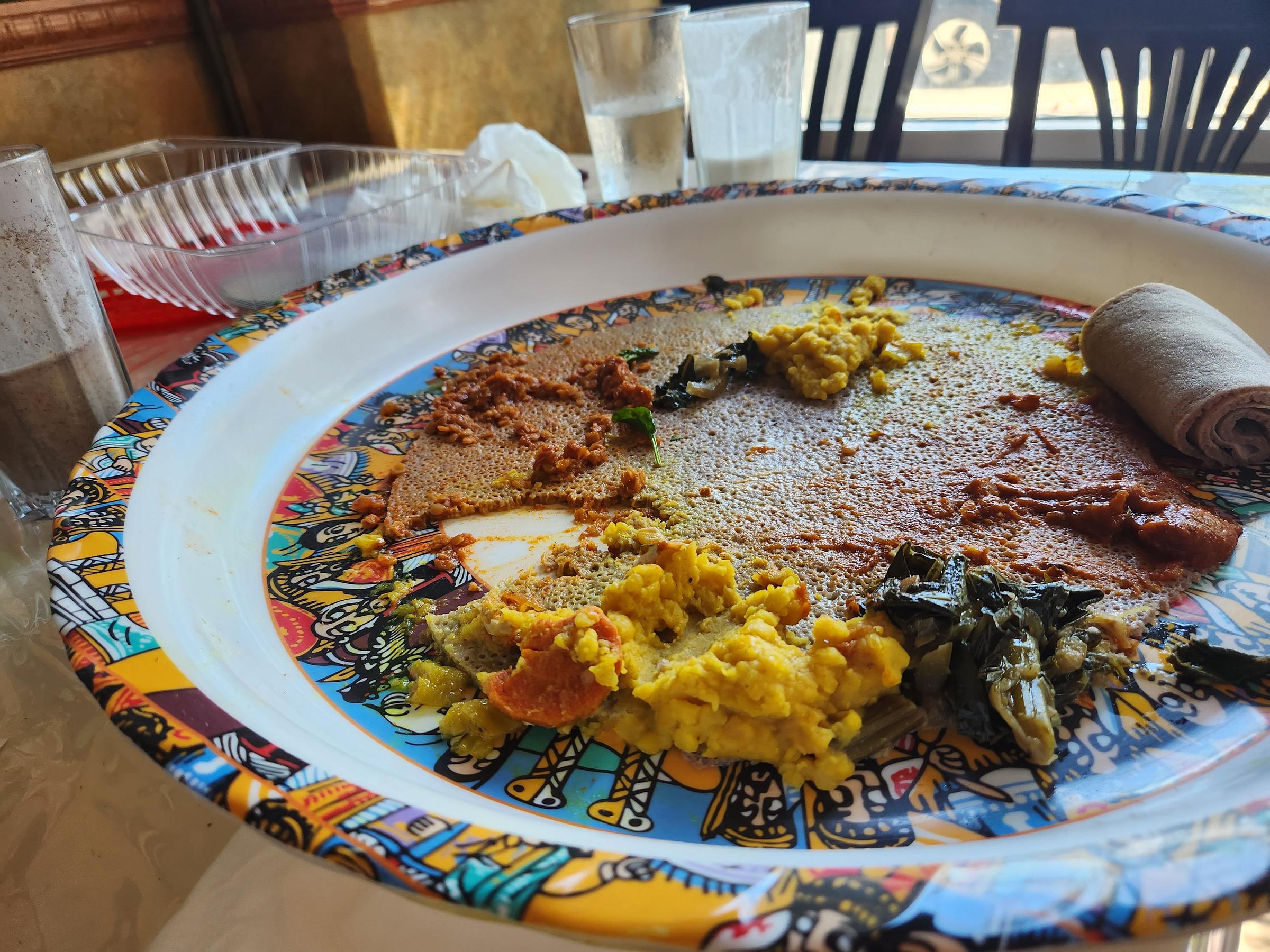 We finished stuffing ourselves, and the bill, pre tip, came to just under $50. We did not clear the plate (I took the small bits home), and we left quite full. Meave noted that often a comparable meal will yield more leftovers. I found the portions of cooked food to be fine, but the rolls of injera were not enough to cover the food we’d ordered.