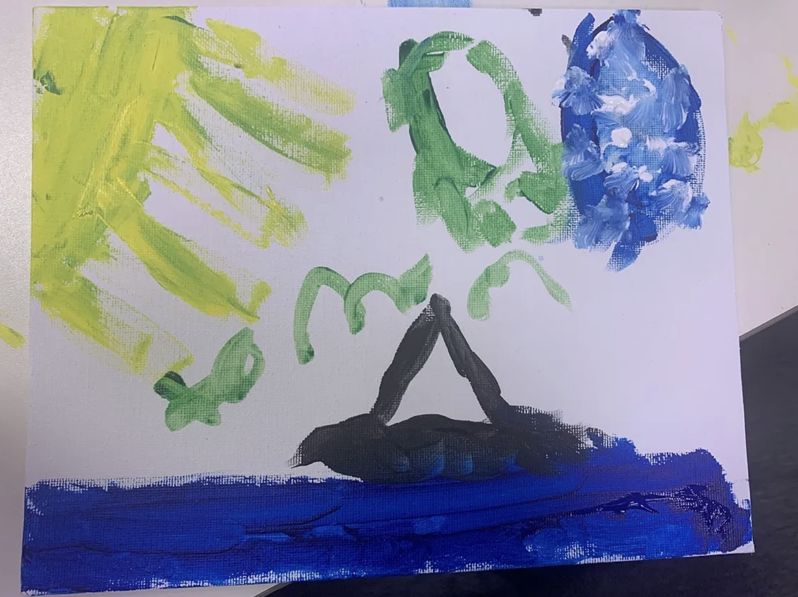 I watched as she used gentle brush strokes to make green and purple streaks that exploded out from the center of the canvas. At first I thought she was making fireworks. Then she added little dots here and there. I realized it was a flower.