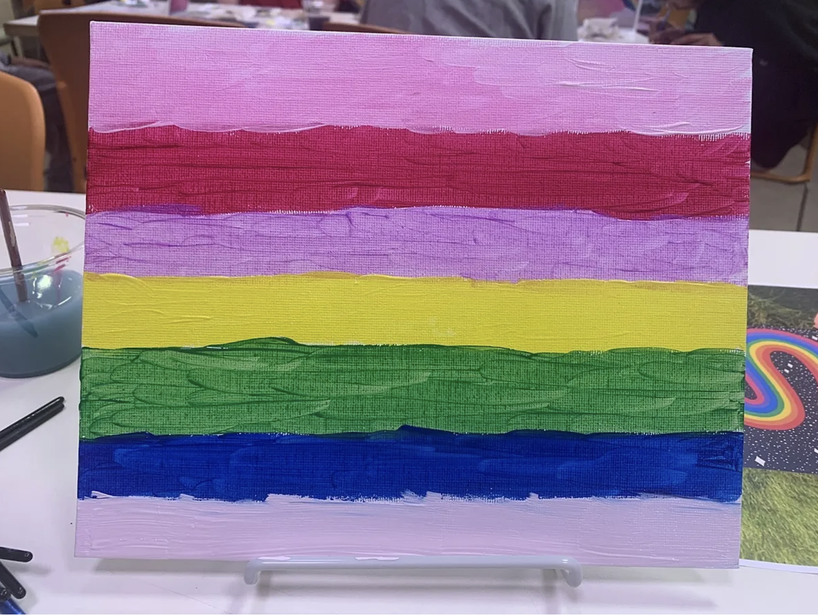 I proceeded to stare at my blank canvas for 15 minutes while Bonni and everyone else worked diligently on their paintings. Eventually, I painted a bright red bar across the middle of the canvas.