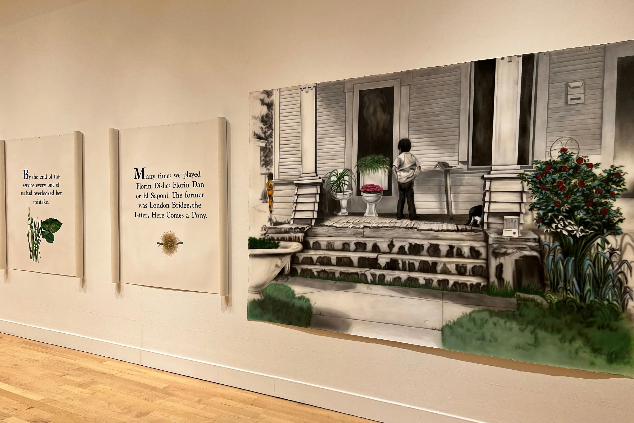 Postales (Postcards) (series 1988), one of the first works you encounter in the show, is a multimedia installation that imagines a neighborhood on the border of English and Spanish. Defining the space is a series of street signs written in Spanish and Spanglish: “S El Paso St / N Il Paso St,” “S Mesa St / N Maysa St.” A collection of large-scale airbrushed paintings of house facades and porch scenes hang on the walls.