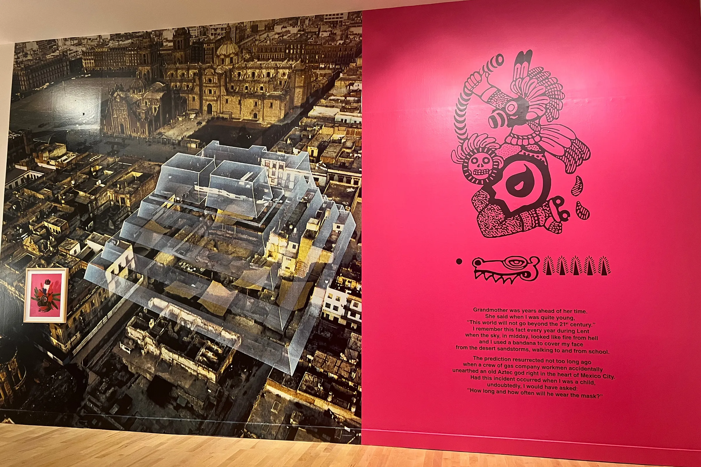 Part of the story surrounding this made-up Aztec deity is a relic the artist created and photographed, which hangs in a frame on top of the vinyl photograph. This object is a World War II gas mask decorated with feathers and beads, mimicking an ancient ethnic artifact. In 1981, while Muñoz was an MFA student, she presented this relic to her classmates as a genuine archeological artifact in a performative lecture; seven years later, it joined the Templo Mayor story, the wall-sized photograph, and the Petrocuatl glyph as an installation at the Kimbell Art Museum in Texas. The name of her god is an irreverent mixing of culture and language, combining the English prefix for “petroleum” and the Nahuatl word for “serpent.” Like many of the works in this retrospective, Petrocuatl reacts to colonial fascinations with ancient artifacts that often supersede an appreciation of genuine contributions to art and culture from contemporary artists like herself.
