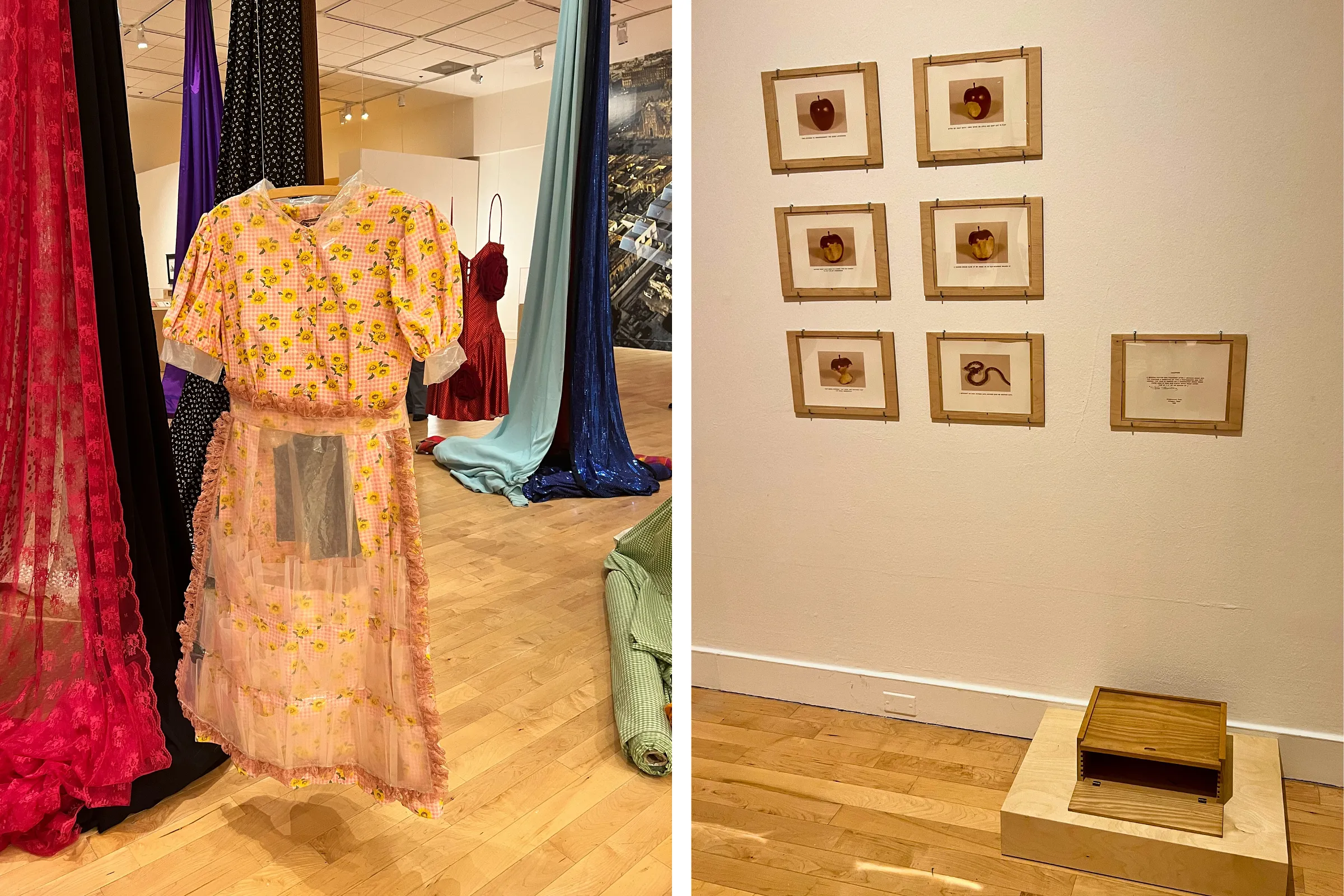 Seen in another gallery within the exhibition, Enlightenment directly relates to the title of the show and her process of unbinding or freeing a story from its structure. One work in the series is a selection of photographs that depict an apple in various stages of consumption, with the final image of the apple replaced with a snake. Referencing biblical themes, the text below each image tells a story of shame surrounding a young girl’s exposure when a gust of wind unexpectedly blows her skirt up, revealing that her mother forgot to dress her in underwear.