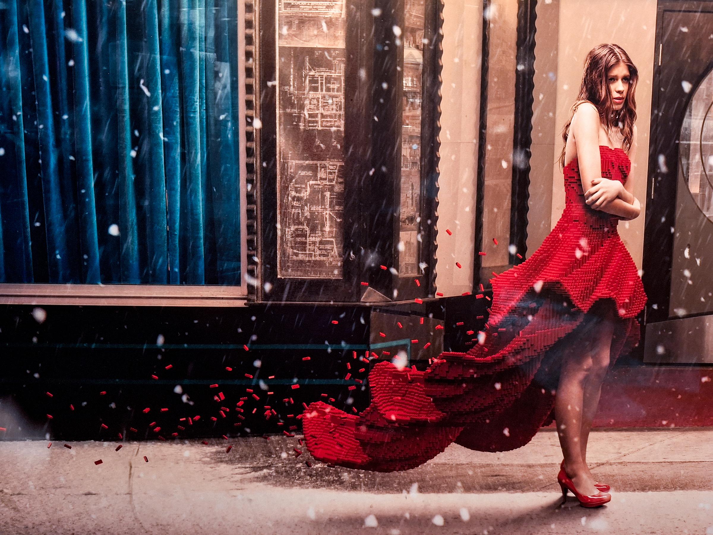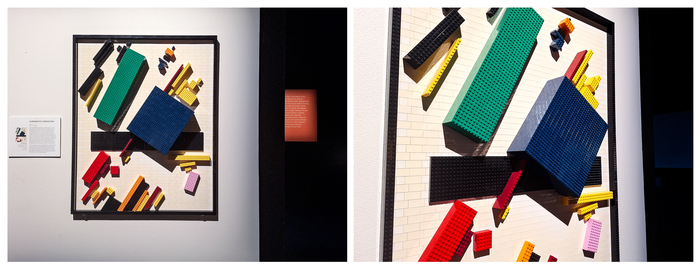 The exhibit concluded with a collaboration between Sawaya and Dean West, a highly-stylized photographer known for his production of poppy composite images. Together, the duo developed tableaus, replacing everyday objects with their Lego counterparts, such as the bright red dress on a model, or the dog a woman is walking, or the towel hanging next to a swimmer. The lego works, which were then displayed in the center of the gallery surrounded by their accompanying large scale scenic images, are noticeably more simplistic in their color variation than his famous painting recreations. But this level of basic color variation and the ordinariness of the objects contributed perfectly within the final composite image, making an otherwise mundane photograph elicit a second or third prolonged look at both the final image and the Lego art displayed.
