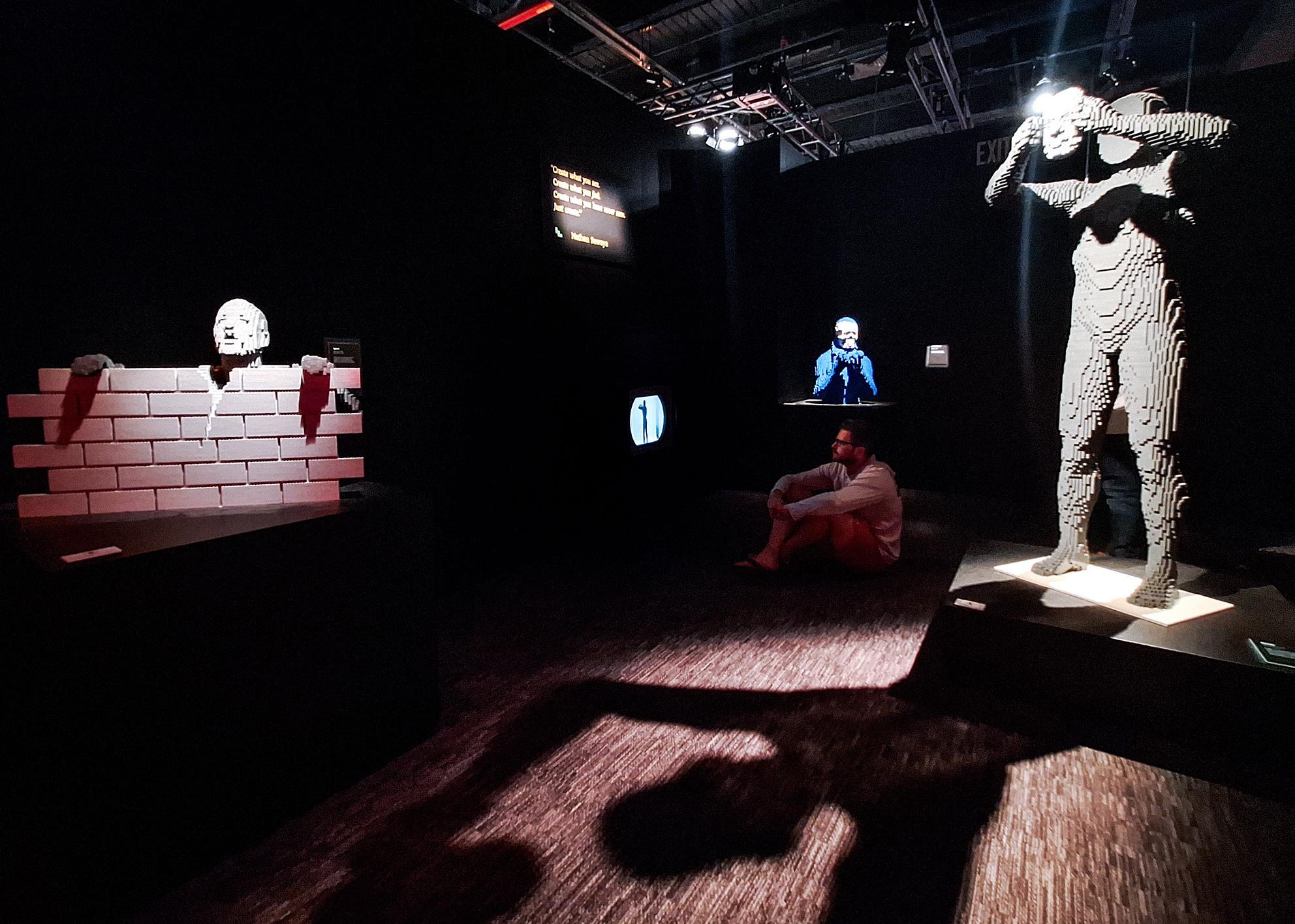 The first few rooms in the exhibit feature Sawaya’s recreations of famous works of artworks: The Mona Lisa by Da Vinci; the Pez Dispenser by Basquiat; a replica of a Moai Head. Most of the paintings were relatively two-dimensional, effectively breaking down the iconic images into bulky pixels which turn closer into the famous works as you walk further away from the sculptures. For other paintings, Sawaya elevates parts of the 2D renderings – and I mean elevate in the literal sense, bringing borders onto another plane or fully building out the abstract lines into tangible blocks. Other times he brought the subjects out of their native sceneries entirely, reimagining them as fully three dimensional. I enjoyed seeing these new depictions of artwork I already loved recreated in such an atypical and unforgiving material. As we turned into the next gallery of full bodied, 360°, to-scale Lego copies of Greek statues and other historical art, I was mesmerized by his ability to capture the curves, depth, and scale of his source material using just the basic everyday Lego bricks that all kids play with. Considering that most of us rely on step – by-step kits to build lego creations, Sawaya’s skill for breaking away from the blueprint stands out.