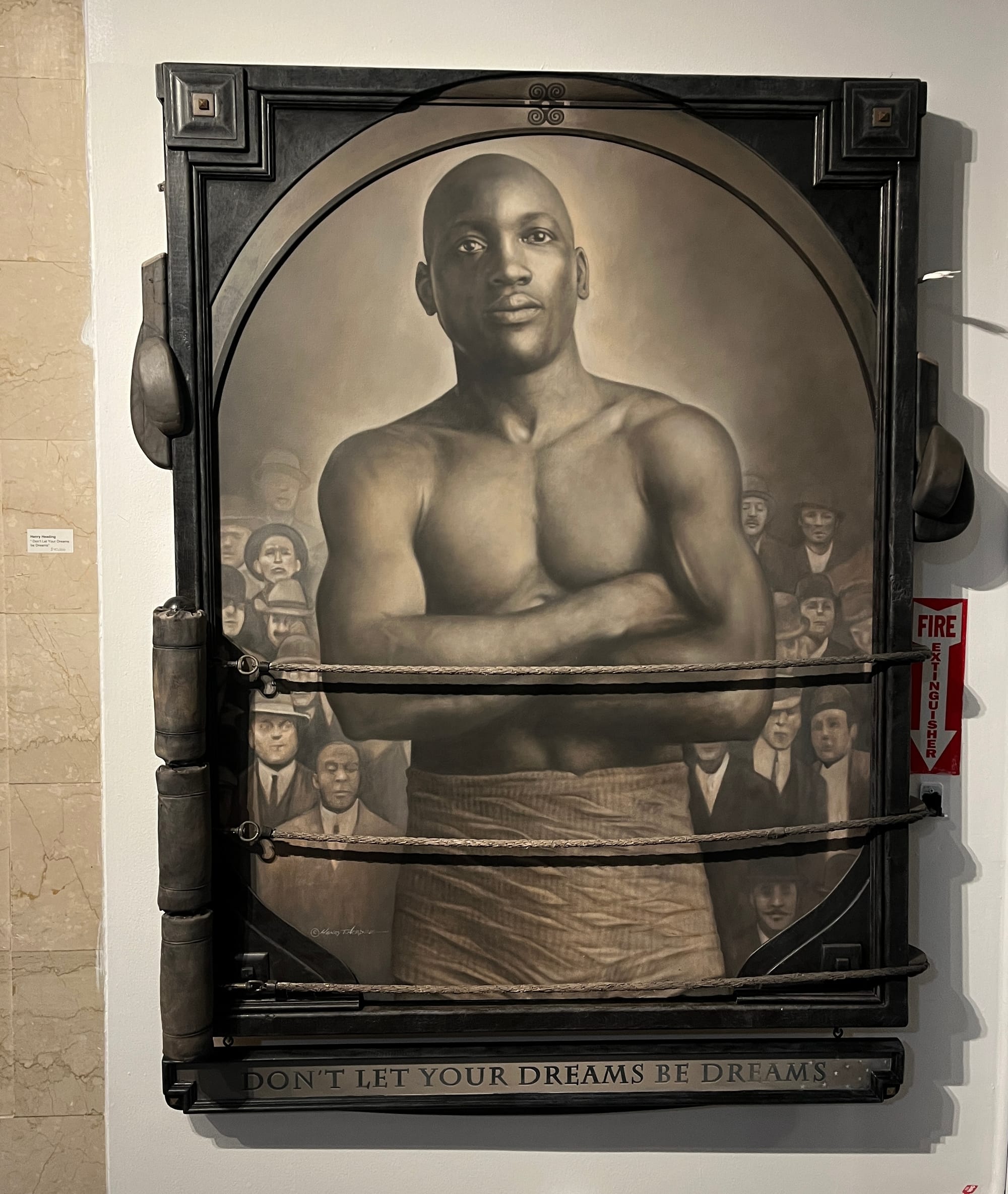 The painting by Henry Heading depicts Jack Johnson, the first African American to win the heavyweight boxing title in 1908. While the quote “Don’t Let Your Dreams Be Dreams” is most often associated with Shia LaBeouf’s viral 2015 speech, it actually traces back to Johnson himself.