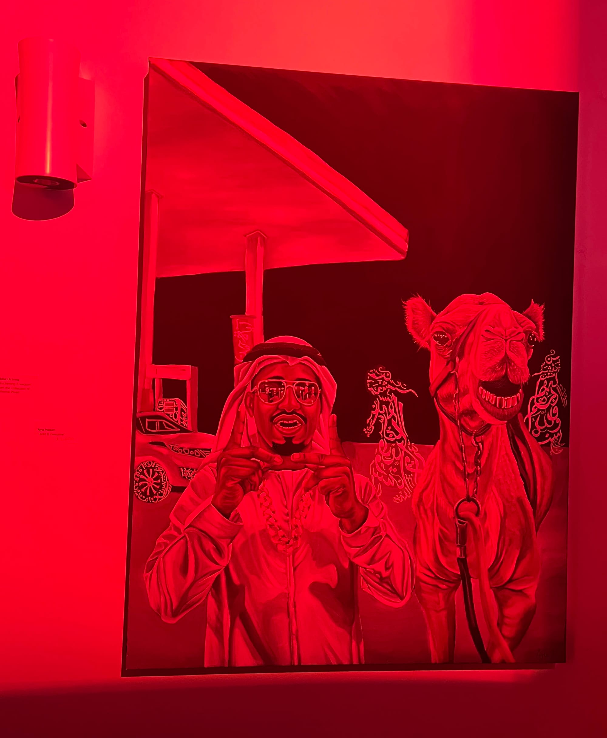 Another standout for me was Gold & Gasoline by Aya Hasan, the 25-year-old founder of the Dearborn Fine Arts Club. The painting beautifully merges modern and traditional elements: Arabic lettering, a camel with a gold grill, and a man in traditional Middle Eastern attire sporting a gold chain, all set in a gas station parking lot.