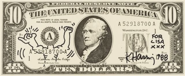 Many see the “Street Art Boy” as a populist Peter Pan who fixated on simplified doodles and was fascinated by cutting-edge music styles, celeb-studded parties, picture-books, and children’s playthings. Radiant Vision spotlighted touching snapshots of Haring the son — his feather-haired yearbook photos, his Apocalypse silkscreen project (1988) with (admittedly controversial) elder William S. Burroughs guiding the artist’s imagery through fucked-up prose. Haring’s boyish mischief shone through in his self-portraits and dollar defacements on display.