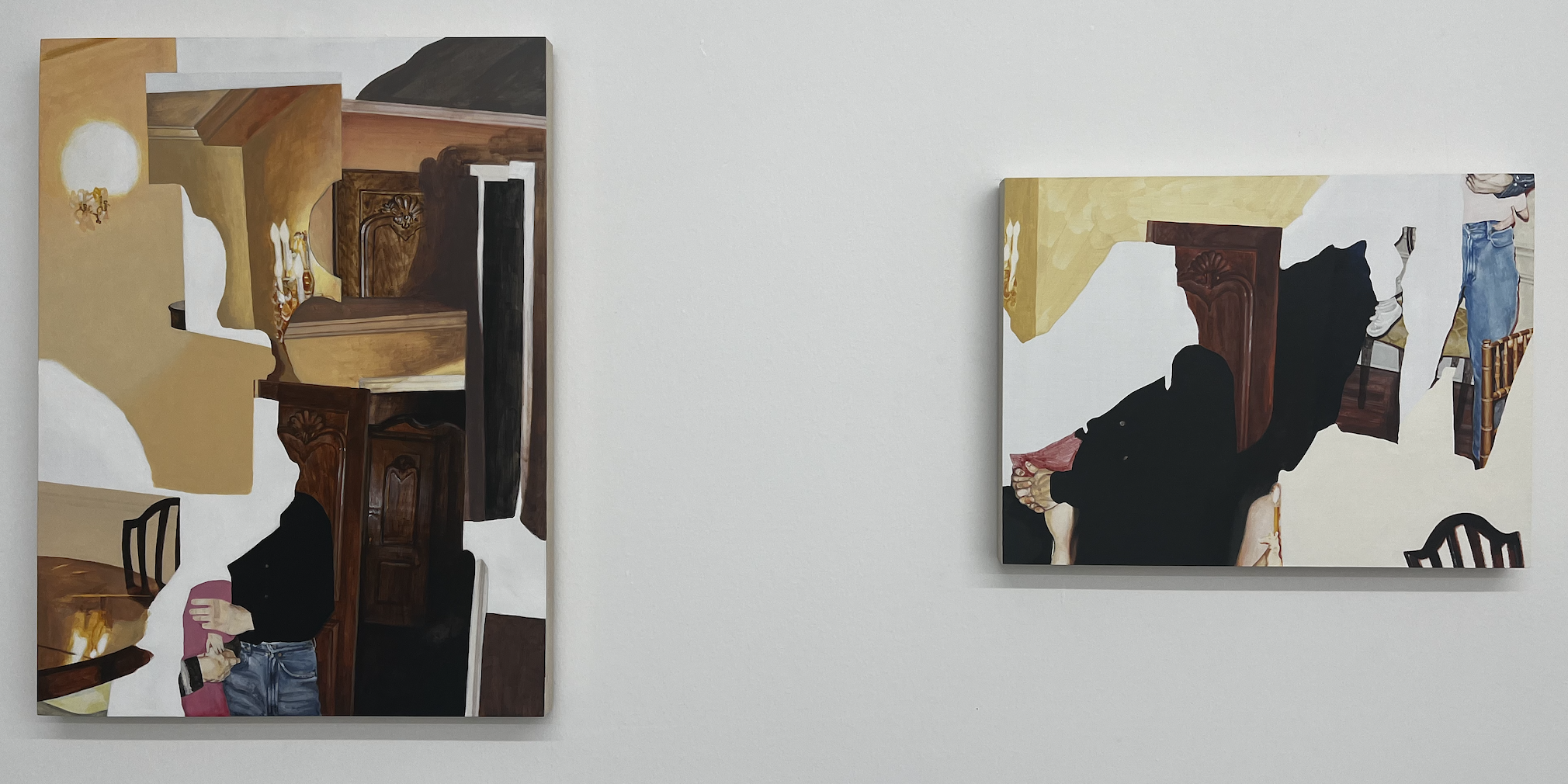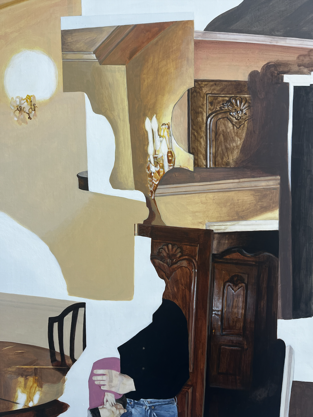Our eyes scan the smooth detailing of dark wood doorways, gaze through the airy slats of dining chair backs, and follow the trail of trim that moulds together ceiling and walls. The human figures that occupy these spaces are portrayed as blunt cut-outs of blank canvas; it’s only the texture of their nature — the gruff blue that belongs to dad-worn denim and the wrinkled tissue of familial hands — that remains.
