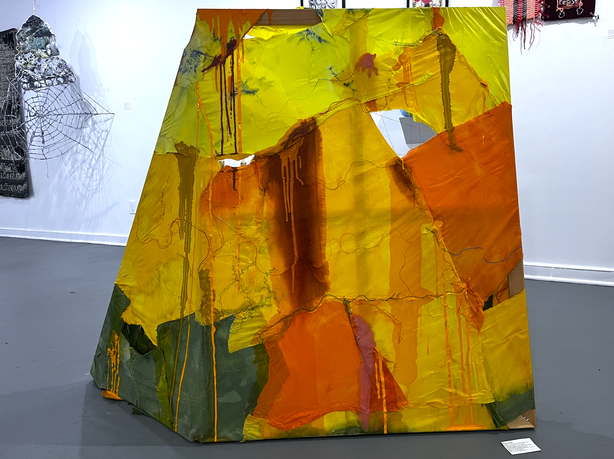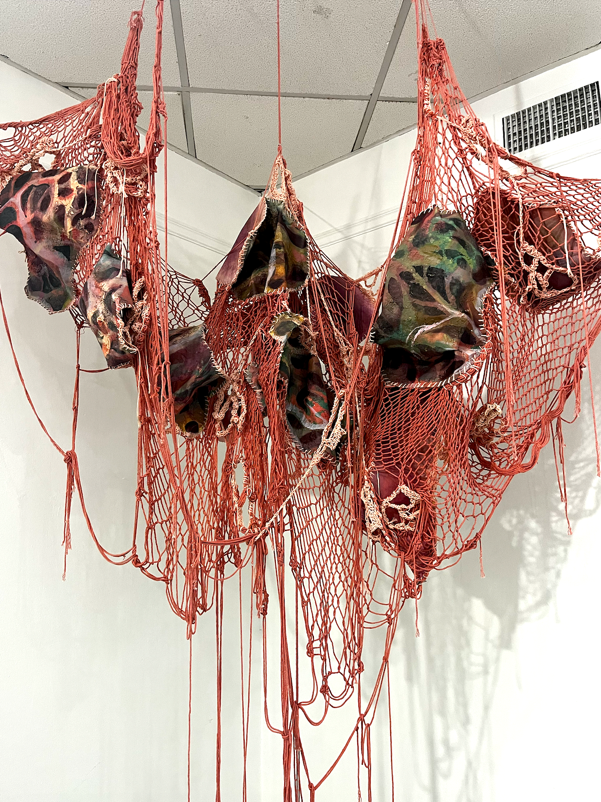 Other artists featured in the show appear interested in the integration of natural beauty into structure. Hanging from the walls are all sorts of delicate tapestries, like pink cobwebs of yarn or walls of tissue paper mirroring stained glass (pictured above). This only helps Lakey’s abrupt installation of misshapen and mummified “nests” stand out. The nests, which gape open on one end like ruptured cocoons, are almost cavernous; their blackened entryways pull us in like ever-expanding pupils.