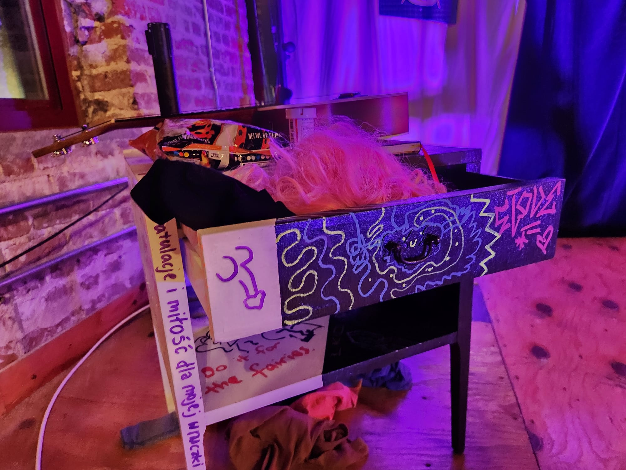 Cohen-Bramwell’s new play Please Don’t Slow Me Down, which concluded its month-long world premiere run at Space 1308 last month, follows the aforementioned self-destructive bipolar 30-year-old Benji (played by Dom Refuerzo), from burnout and therapy to an unexpected rave (at his old school, no less), and furthermore unexpected healing and acceptance found through the kind words of a stranger. For this performance singer Tristan Marcelle opened with a solo set, and topically relevant visual art from Jo Williams was on view against one wall.