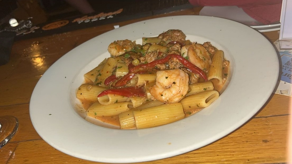 The main course of the evening was the fra diavolo, a sausage and shrimp dish with spicy tomato sauce, onions, garlic and red peppers. You can never have enough garlic, and in particular I thought the diavolo could use a little bit more. It was missing the kick I was expecting from a meal with so many pungent flavors. The wings were actually spicier than the diavolo turned out to be, and the stacker gave a stronger taste of tomato in its sauce. It did pair nicely with the sangria though, which is something I learned last night: Red wine goes with pasta.