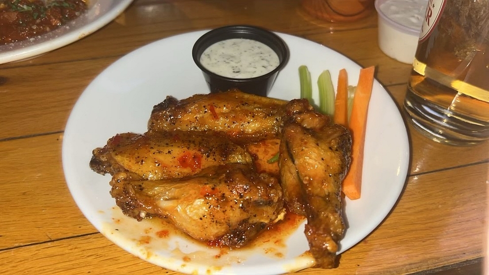 The food came out quickly and piping hot. It’s me, so you know I had to try the wings. This time I got the sweet chili wings (fried hard, of course). The wings glowed a honey orange color in the low light of the restaurant. They were perfectly crispy, cooked well all the way through to the bone, The wings were more spicy than sweet, with each crunchy bite full of chili flavor.