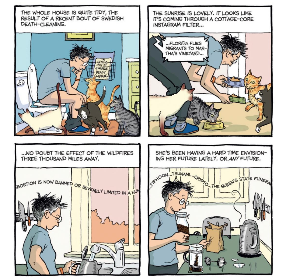 One thing Spent does well is illustrate a specific mood from the past few years: this low, constant hum of trouble. Bechdel takes us through the COVID lockdown, a climate catastrophe, the repeal of Roe, the war on Gaza (albeit briefly), and an impending second Trump term, all while Bechdel herself navigates the mundane ways in which her own life interfaces with the power structures which caused these events. Bechdel floats off of money from the Amazon TV adaption of her book and she chooses to sell her new book to a publishing company owned by conservative billionaires undermining democracy.